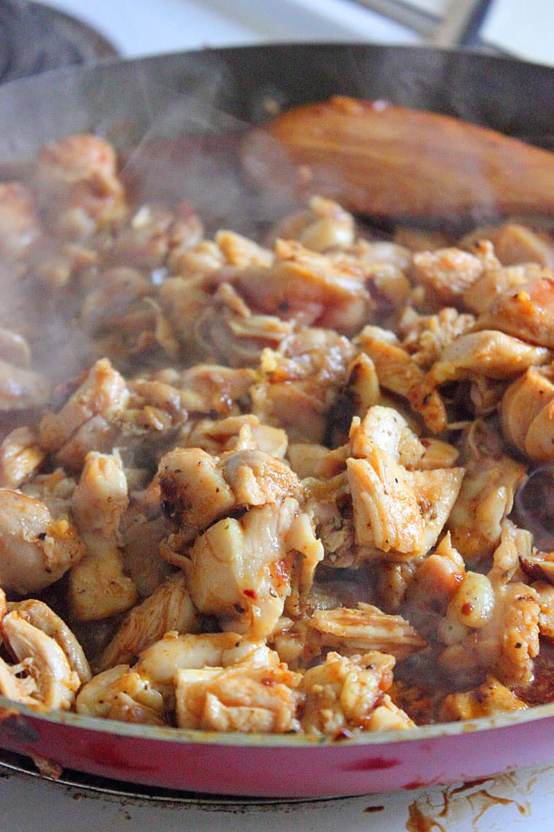 - Turn the heat down between low and medium and add the water and tequila to the bits that was left behind by the chicken. Stir and scrape the bits from the pan and allow to simmer for 3-5 minutes. Meanwhile, dice the chicken and set aside. Now, add the taco seasoning to the pan and stir so the seasoning completely dissolves. Return the diced chicken to the pan and stir so the seasoning coats the chicken. Allow to cook for 5-10 minutes.