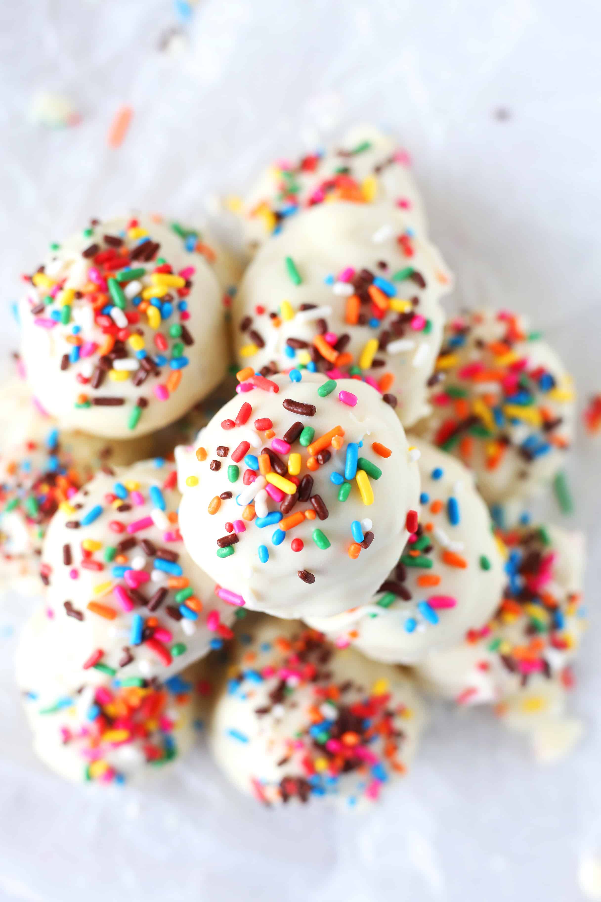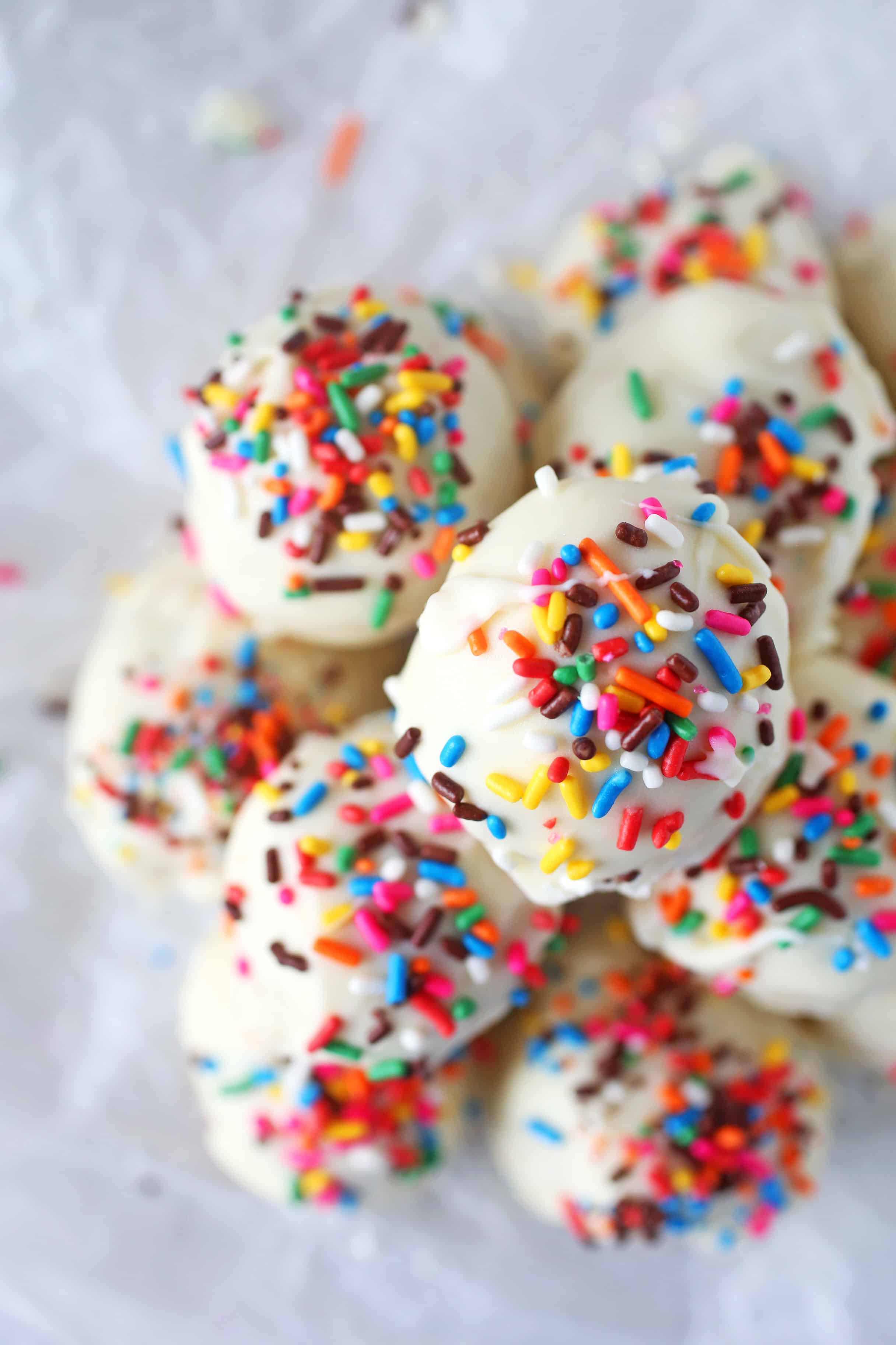 - Melt the white chocolate coating, dip the balls into the white chocolate with a fork, shake off the excess and place back onto the parchment paper and immediately sprinkle with sprinkles. Repeat until all of the cake balls are coated and place in the refrigerator until ready to serve.
