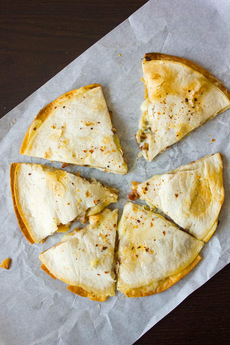 - Take one of the tortillas and brush lightly with olive oil on one side (which will be the bottom side). Sprinkle with gruyere cheese, sprinkle with about 1/3 of the shrimp mixture, layer more gruyere cheese on top, and place another flour tortilla on top of the cheese. Brush with a little olive oil, sprinkle with red crushed pepper and bake for 5-7 minutes until golden and crisp. Repeat with the remaining shrimp filling and flour tortillas. Cut into triangles and serve.