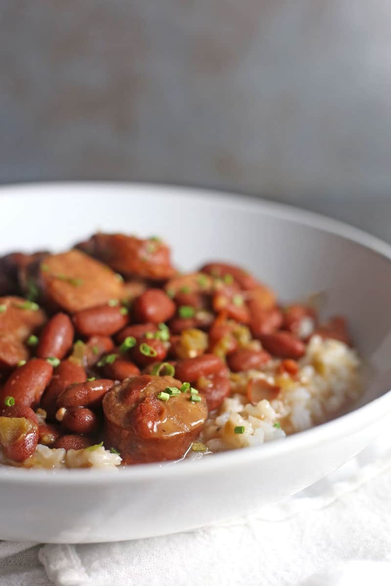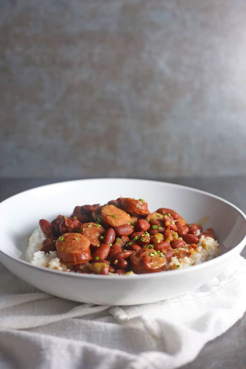 This recipe, in my opinion, still has all of that amazing flavor but it cuts down on half of the prep time. In this Red Beans and Rice recipe, I don’t soak my beans because I used canned beans, including the liquid, and I don’t use any bacon fat but I do use a ham hock for flavor and cook with andouille sausage. I use a variety of different seasonings to get that 2-day old flavor. I still let the beans cook for a few hours, or at least until the meat and fat from the ham hock start to fall off. Then I serve the beans over fluffy rice with a side of delicious Skillet Buttery Cornbread.