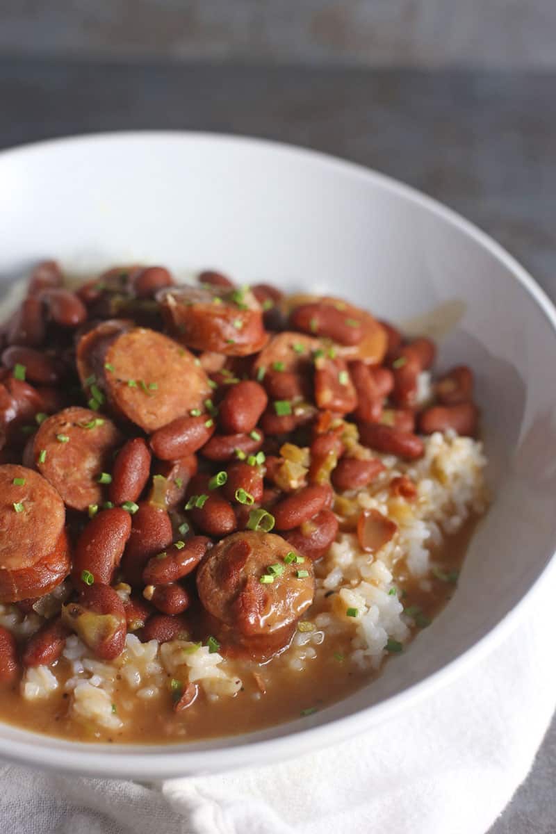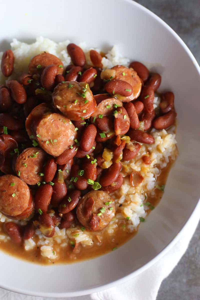 - Take the andouille sausage and add to the pot 30 minutes before serving. Add more seasoning if necessary and serve over cooked white or brown rice. Top with chopped green onion, if desired.