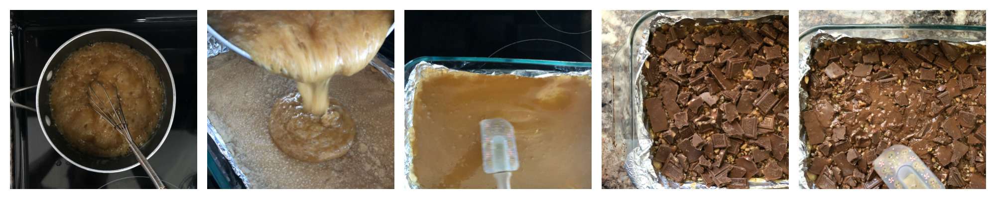 I made this recipe twice, so let me say that first. When you make the toffee topping you’re going to see the sugar and the butter won’t come together at first. This is fine because it will. Bring your sugar and butter to a foamy boil because that is what you want. Whisk the mixture as this is happening. Once the mixture has come to a boil, take it off the heat and pour it on the crust. You still may see a little separation of the sugar and butter and that will not ruin the taste of these bars. I want to say that if there are people out there who worry if they did the right thing when making these bars.