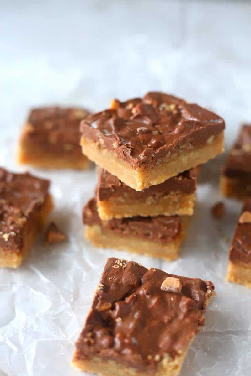 In the recipe video, you will see the chocolate I used were semi-sweet chocolate chips, which you totally can use. However, in the first round of testing this Easy Toffee Bars recipe I used Symphony Chocolate Bars with toffee pieces for an added toffee flavor and that is my preferred version of using the chocolate. If you have a favorite chocolate candy bar that would make sense for these Toffee Bars, I don’t see the harm in giving them a try.