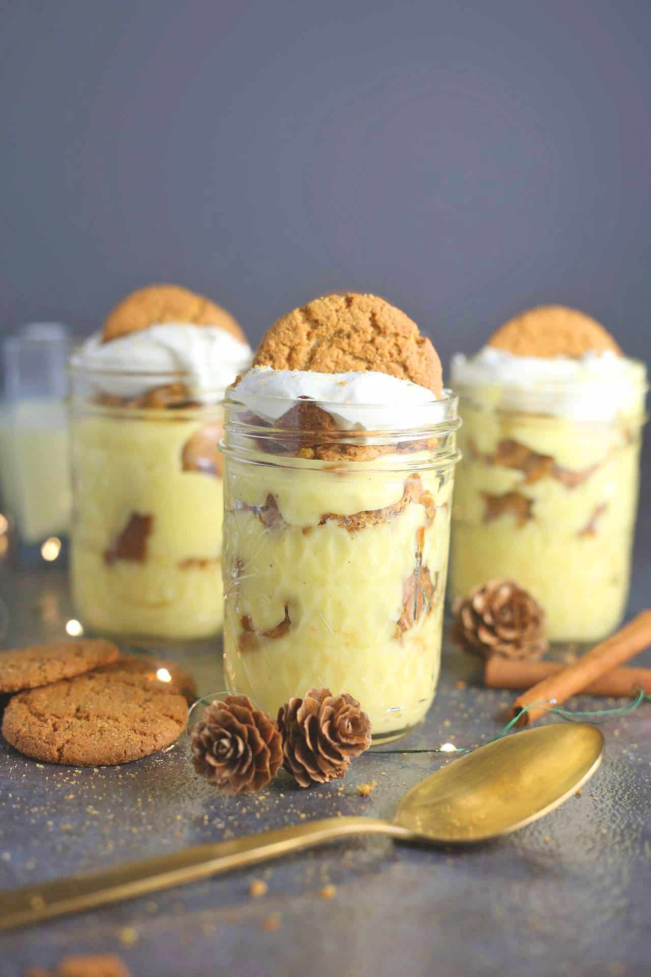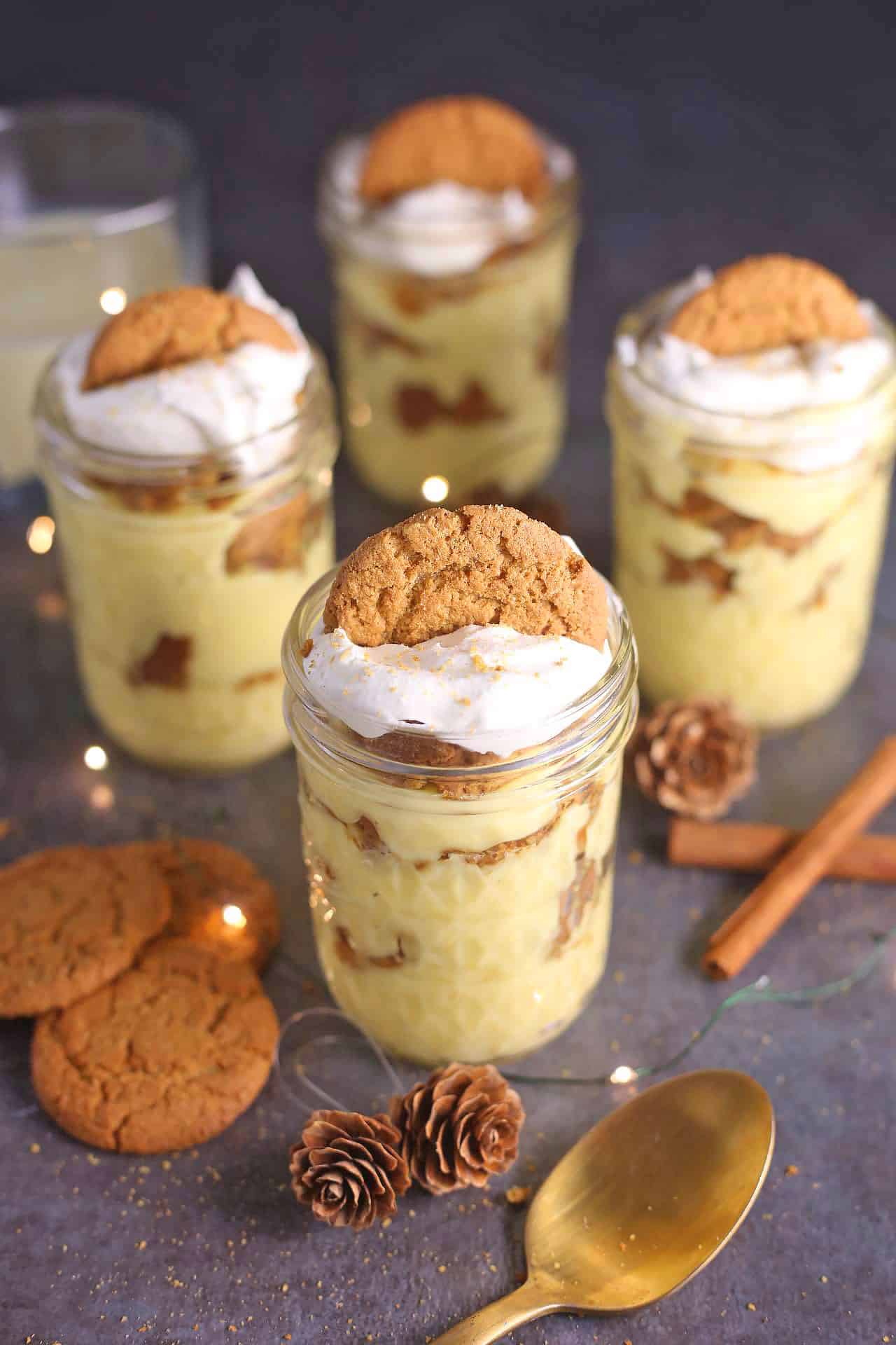 Simplify your holiday treats and make a simple Eggnog Pudding Parfait that is layered with Ginger Snaps and topped with whipped topping. These parfaits are a perfect crowd-pleasing holiday dessert.