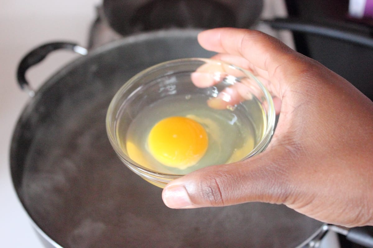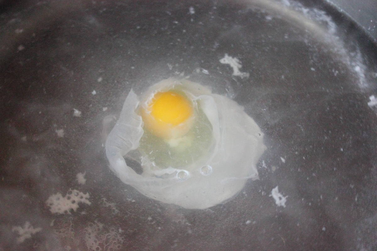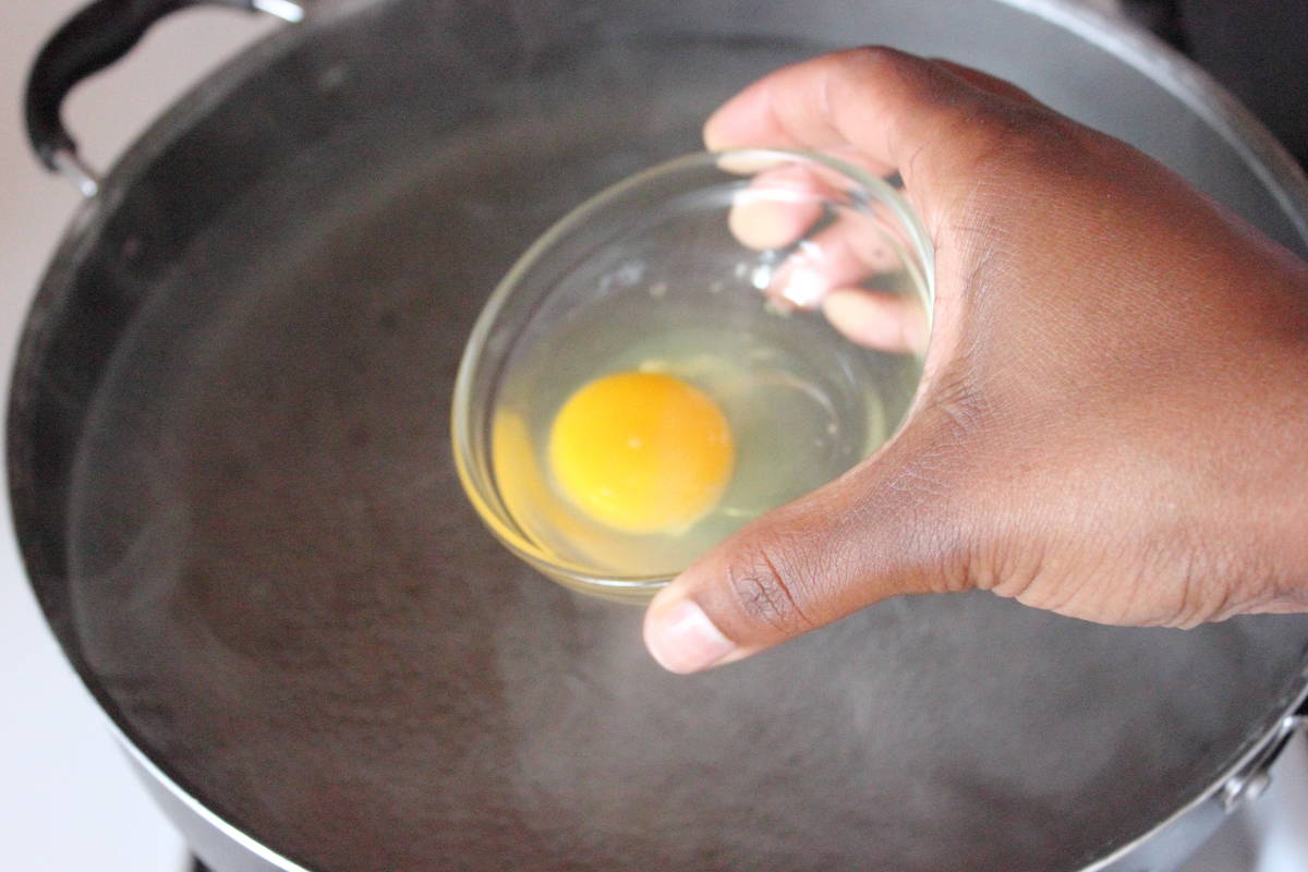 - – Break an egg into a ramekin and carefully place the egg into the water where it is submerged with water and allow to cook for 2-3 minutes. Remove with spoon strainer and pat dry with a clean kitchen towel or napkins and place aside. Repeat the process for the remainder of the eggs.