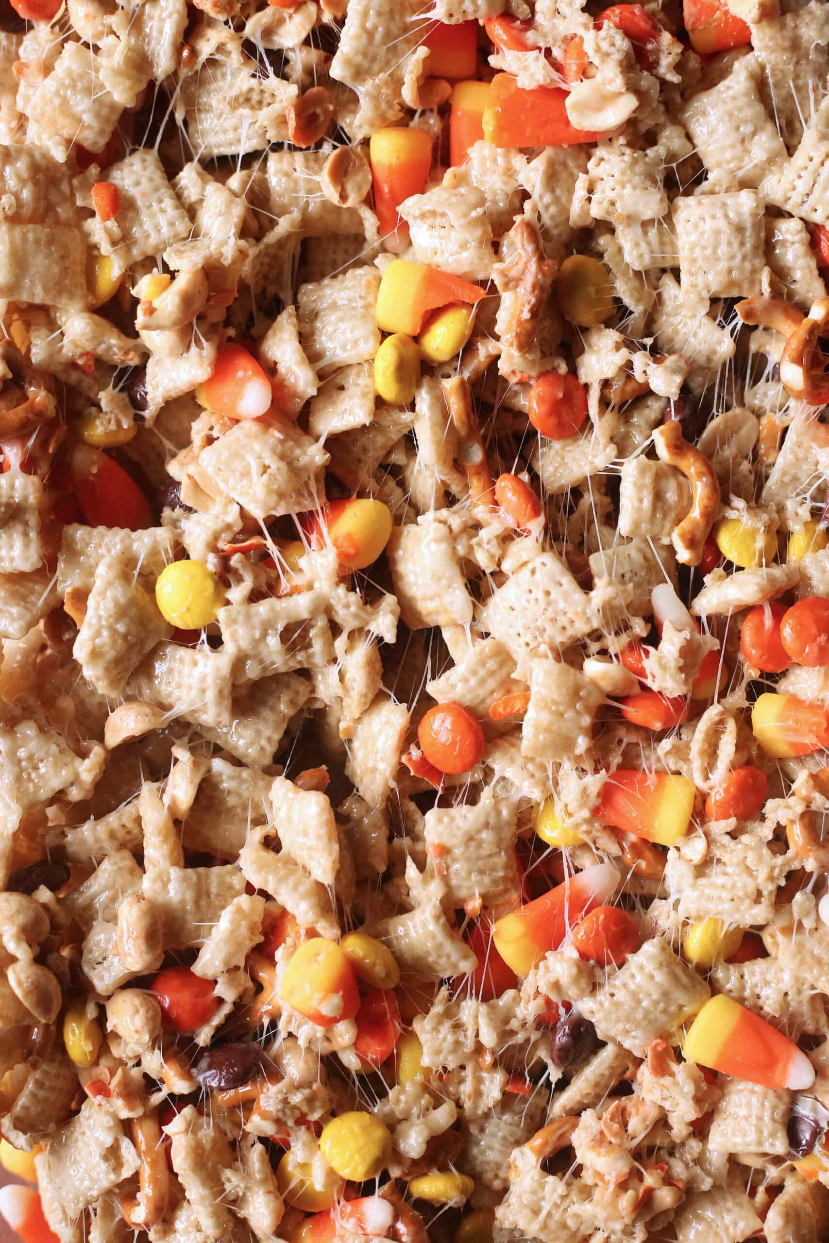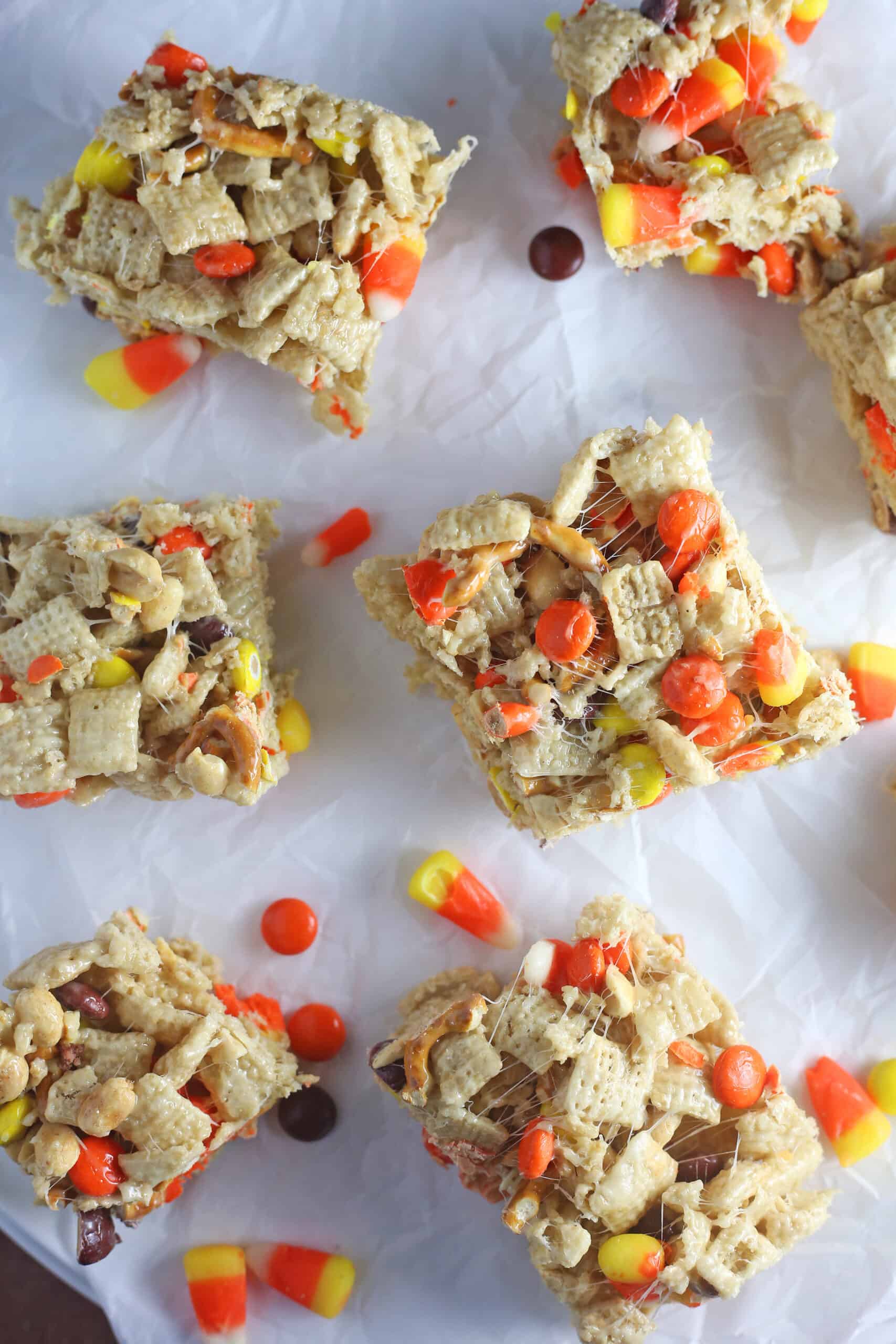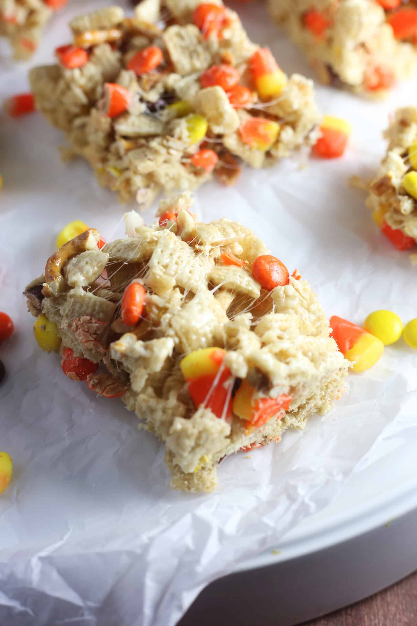 - Right away, add the Rice Chex Mix, crushed pretzels, and stir into the melted marshmallows. Add the salted peanuts, Reese’s Pieces, and candy corn and stir until evenly mixed. Pour out onto the prepared casserole dish. All the mixture to set, about 30 minutes to an hour, and cut into squares.
