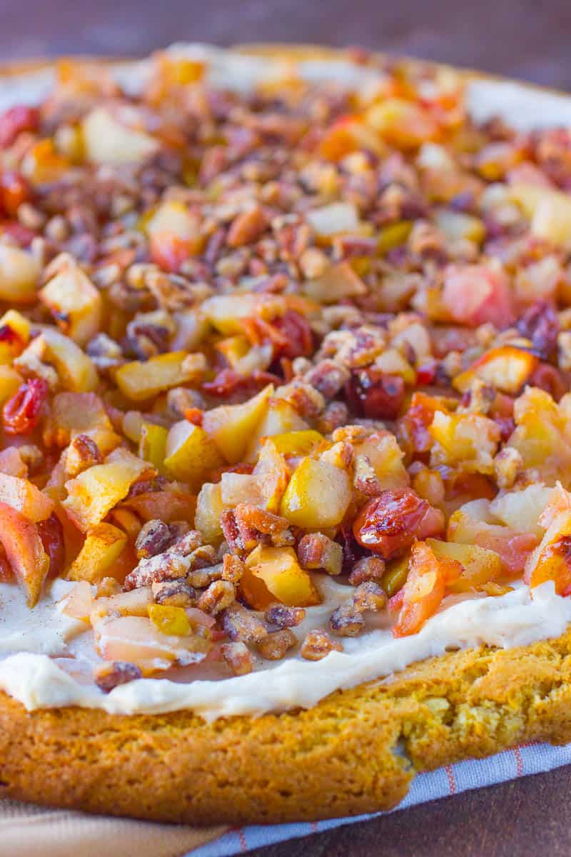 If you like traditional Fruit Pizza, you will love this Fall Inspired Fruit Pizza with roasted fruit, roasted pecans, and pumpkin sugar cookie dough!