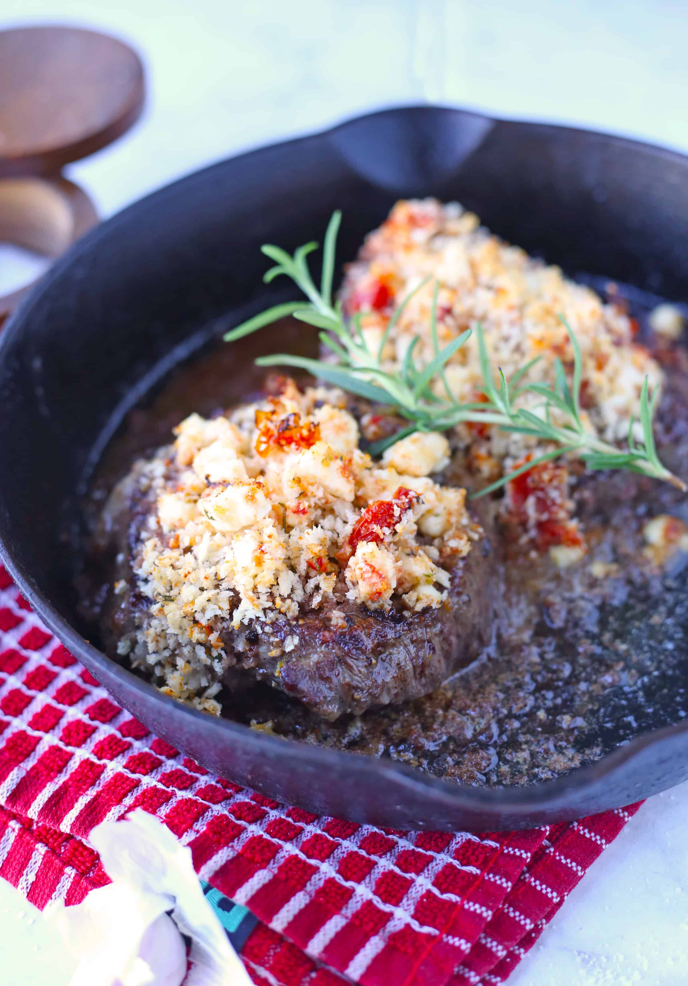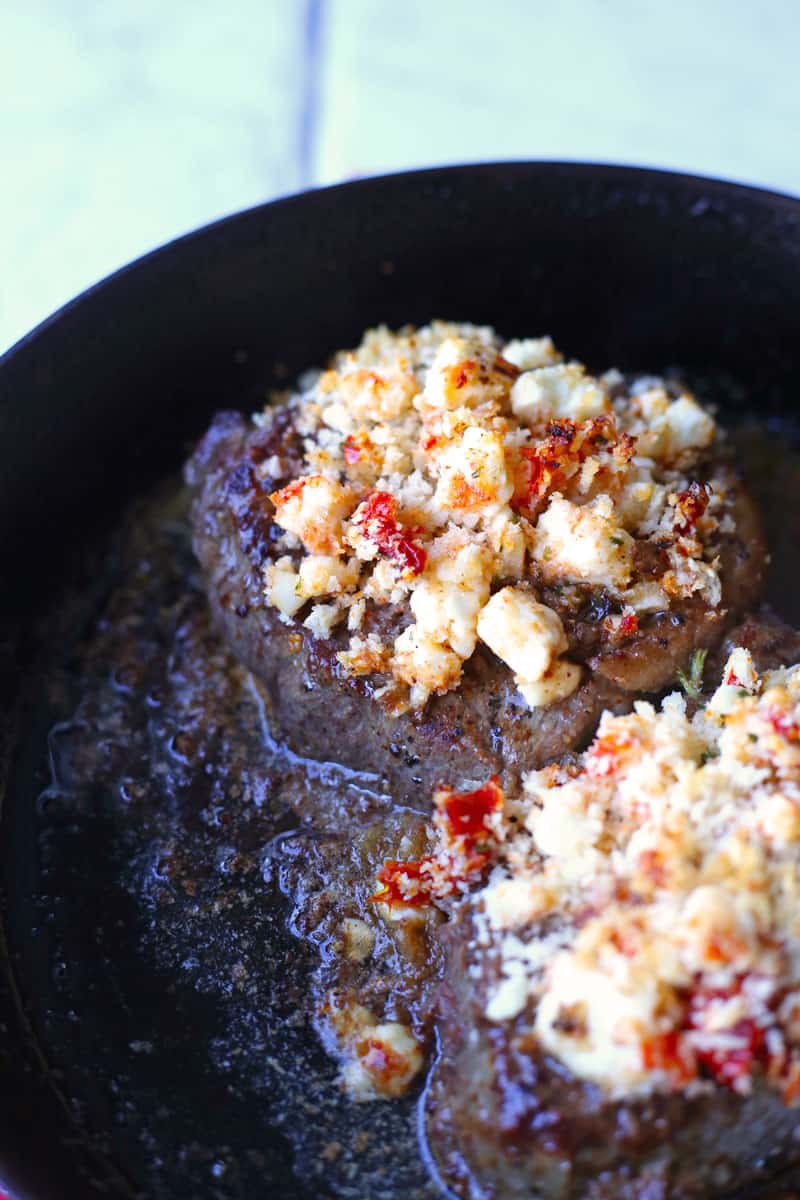 - In a medium bowl, combine the feta cheese, cream cheese, sun-dried tomatoes, rosemary, garlic, and panko crumbs and mix just until well combined. Remove the steaks from the heat and place ½ of the feta crumble on both of the steaks. Add the butter to the pan and place in the oven for 5-7 minutes, just until the crumbs are slightly golden and crisp.