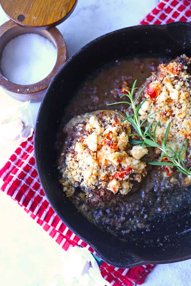 These Feta Cheese Crusted Steak Medallions are delicious and topped with an amazing crust with panko breadcrumbs, sundried tomatoes, fresh rosemary, and feta cheese.