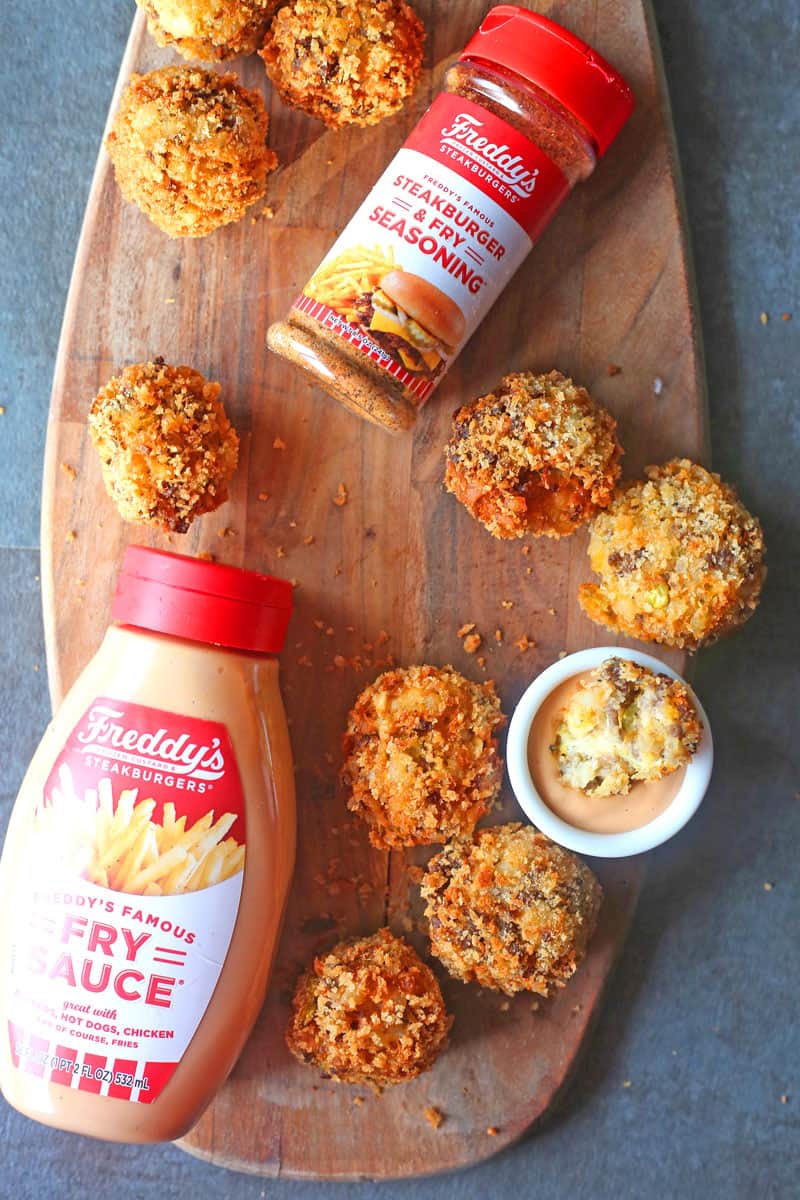 These Fried Cheeseburger Balls are the perfect appetizer that tastes just like a Cheeseburger. Enjoy with Freddy’s Steakburger and Fry seasoning!