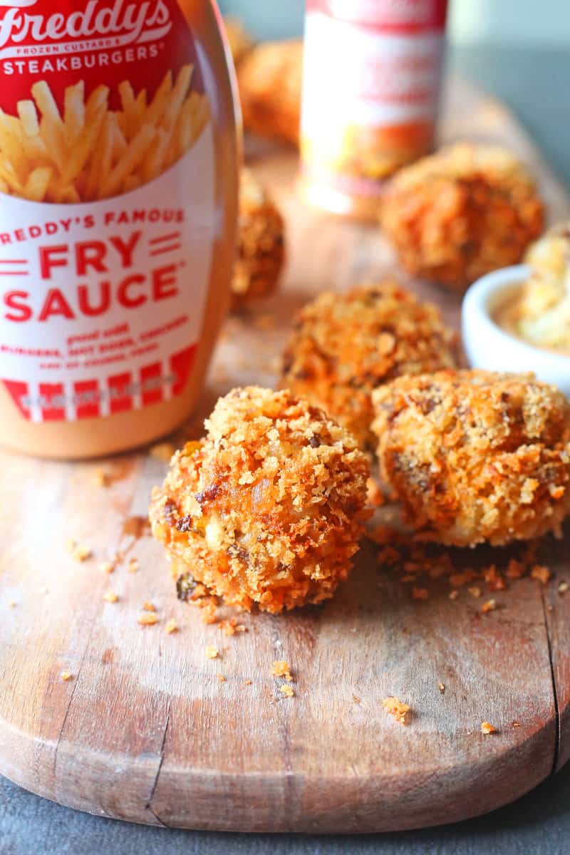 - In a medium shallow bowl, pour in the panko bread crumbs in a large shallow bowl. Use a med-sized cookie scooper and scoop some of the mixture into your hands, roll in a ball, and roll in the panko breadcrumbs, and turn to the hot oil. Cook on both sides for about 1 minute and the balls will be golden brown. Use a mesh spoon and turn to a cooling rack lined with paper towel. Sprinkle with Freddy’s Steak and Fry Seasoning. Allow cooling slightly before serving.