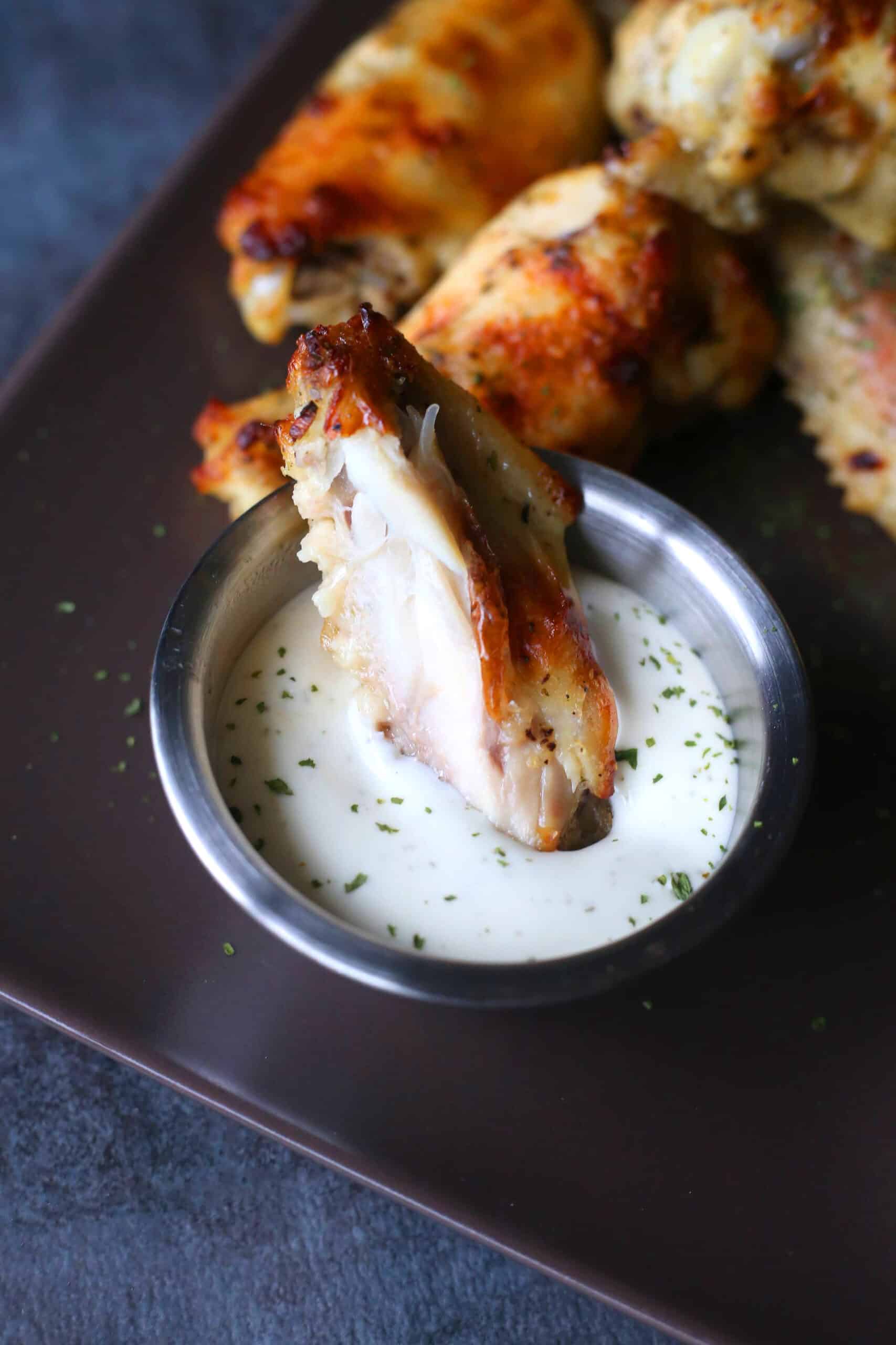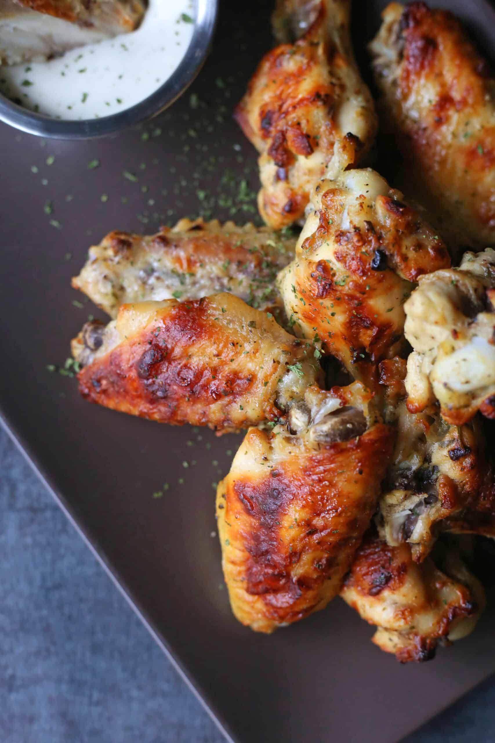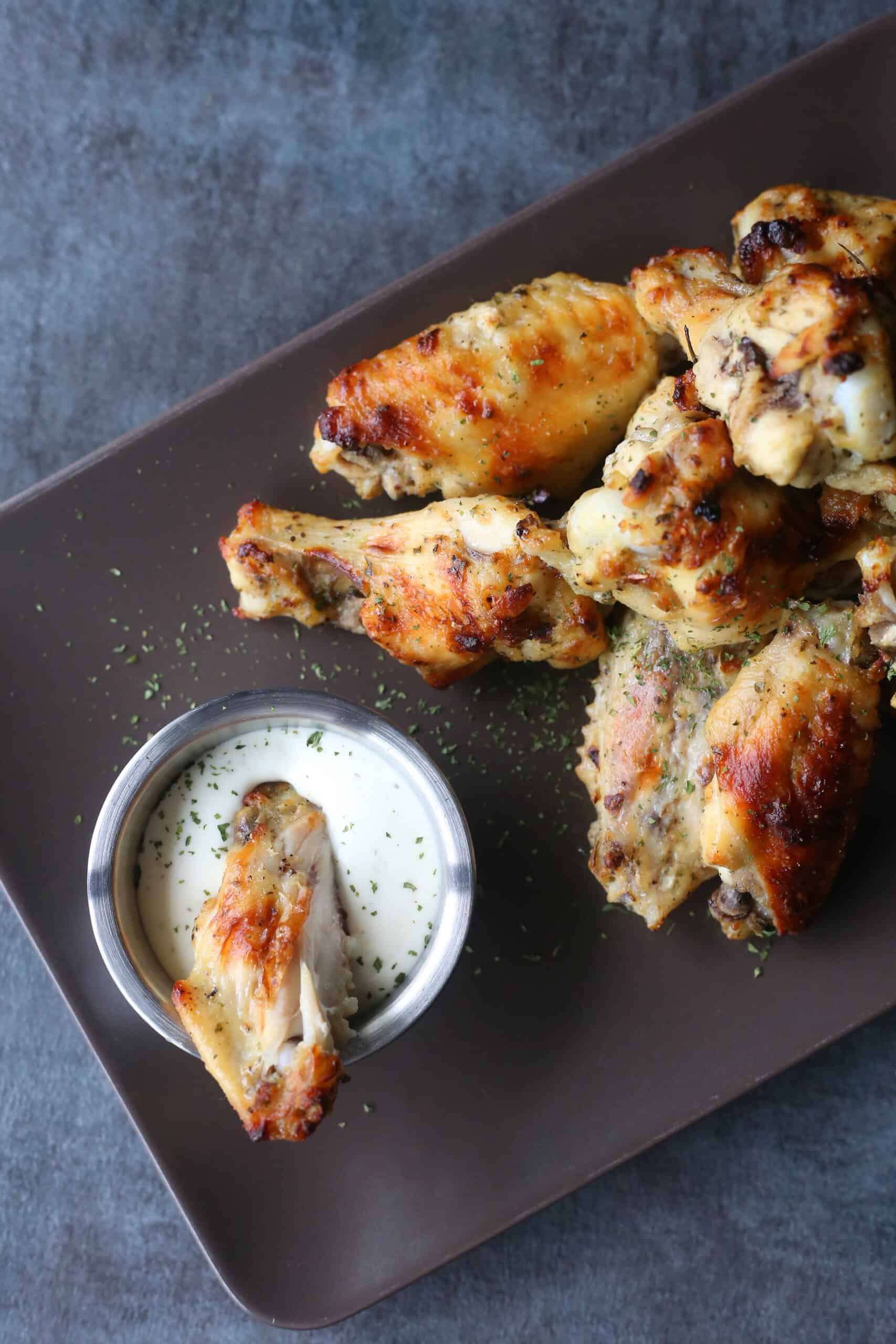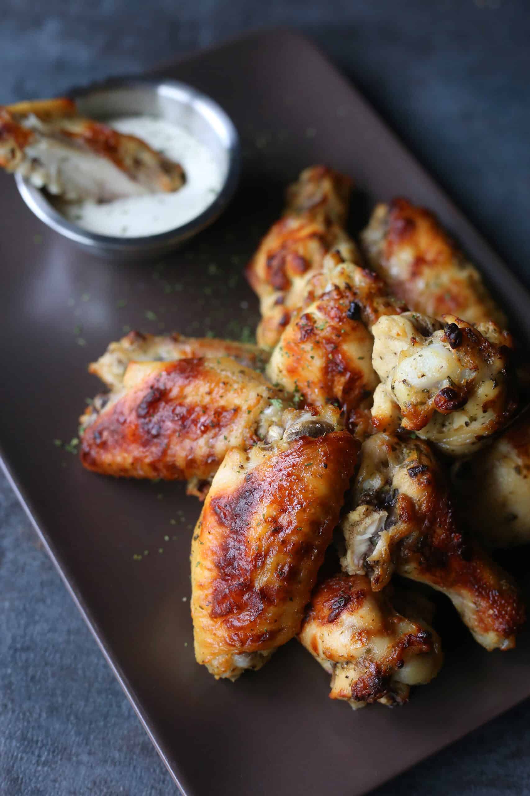 Now that people come to me when they want Happy Hour, I sometimes make my Chargrilled Chicken Wings, Boneless Buffalo Chicken Wings, or Buffalo Bone-In Wings, and my Loaded Baked Potato Skins for friends and family. Now I am adding another chicken wing option into the mix with this Garlic and Ranch Crispy Baked Chicken Wings recipe.