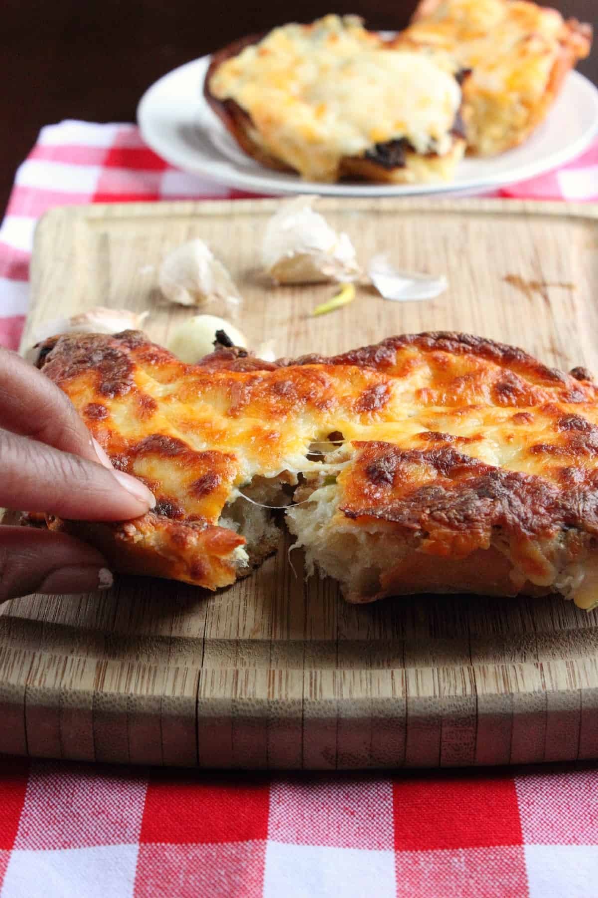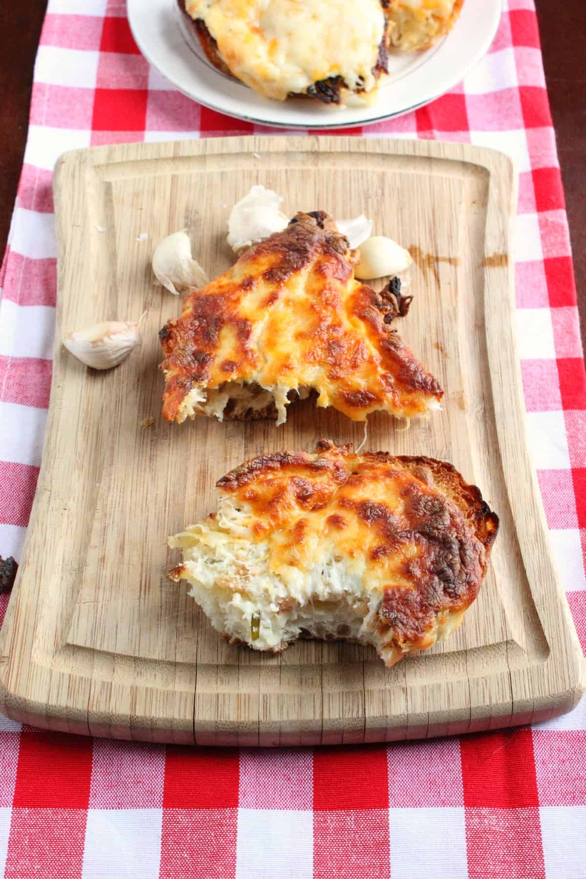 - Once all bread is finished, sprinkle with a little garlic powder and spread some of the mayo mixture on top of each piece of bread. Mix the remaining 3/4 c. mozzarella cheese and 3/4 c. sharp cheddar cheese together and sprinkle on top of the bread. Bake in the oven for 10 minutes until the cheese is nice and bubbly.