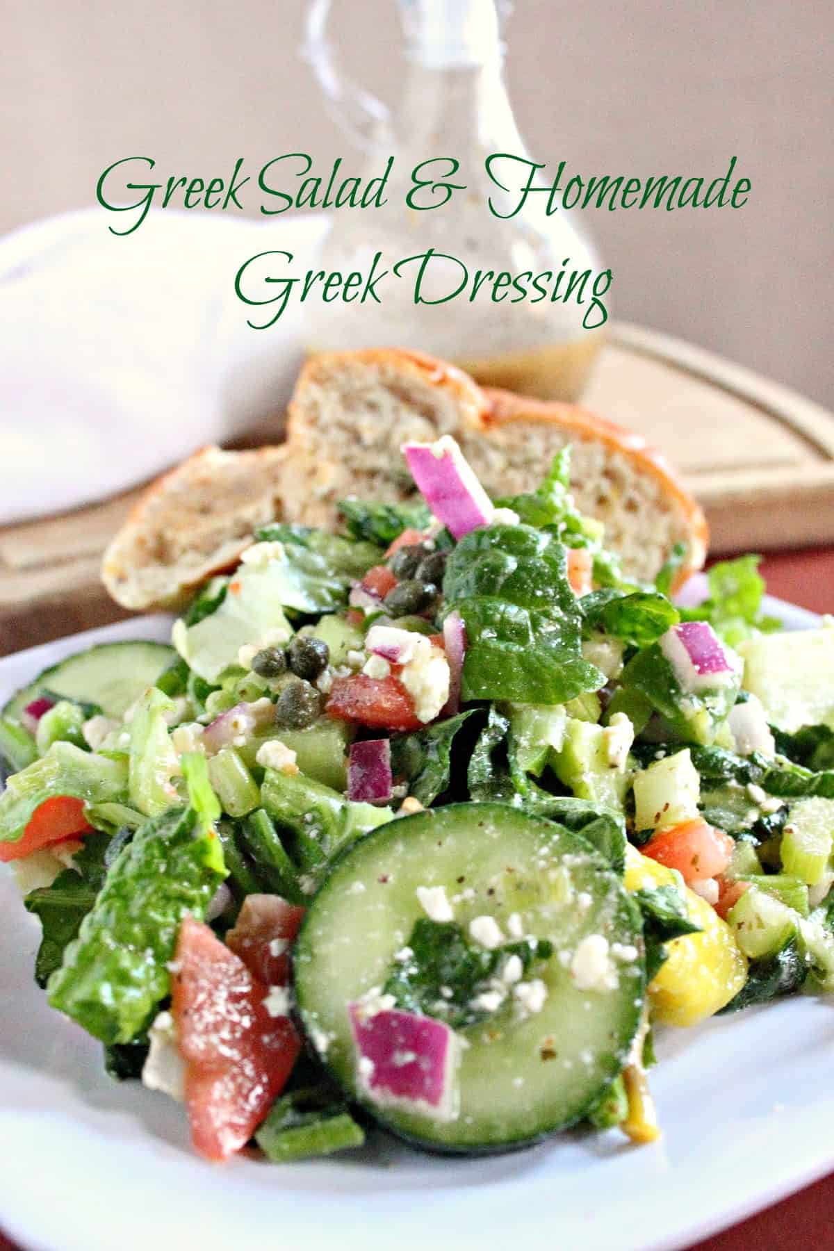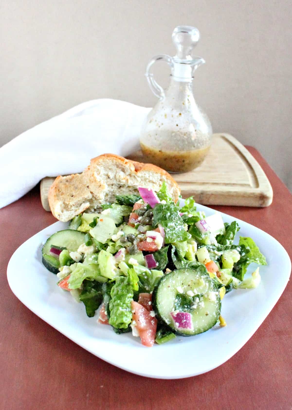 - In a food processor, blend all the ingredients for the dressing. Taste to make sure that it is seasoned to your liking. Squeeze the half lemon on the salad and drizzle the salad with some of the Greek dressing and toss. Serve with warm french bread.