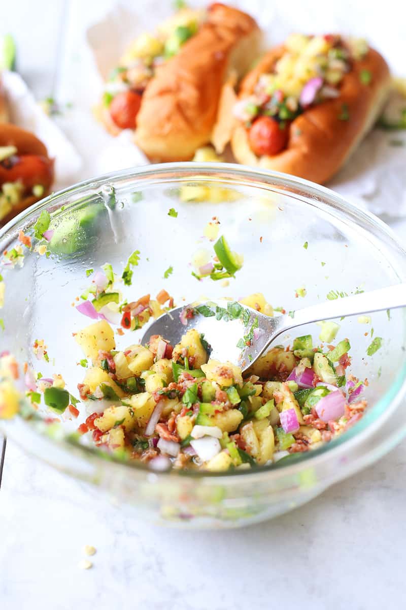 - In a small mixing bowl, combine the chopped pineapple, jalapeno, cilantro, bacon bits, red onion, and honey and mix together. Add a pinch of salt to taste.