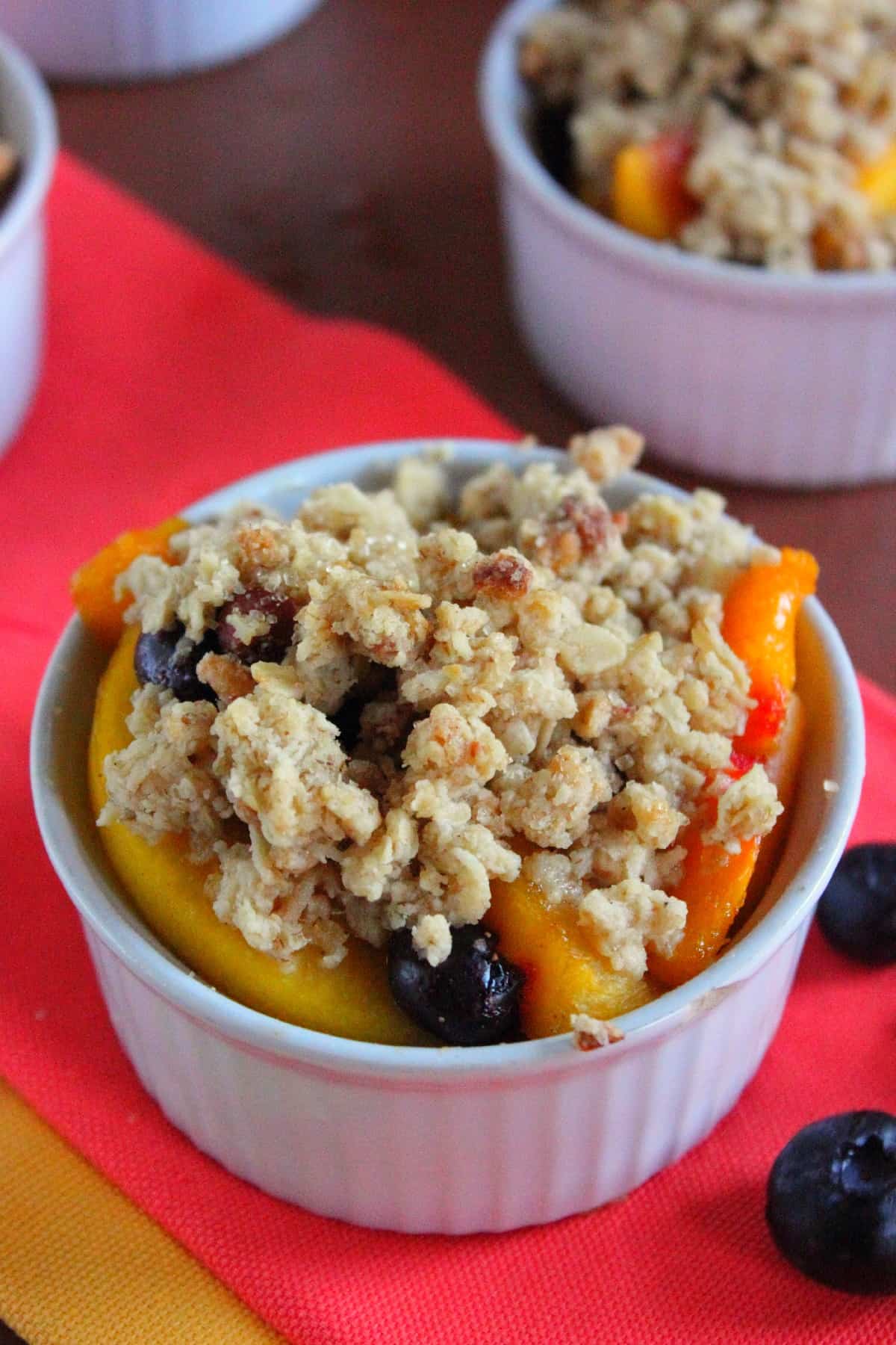 I find the most challenging thing to do in cooking and baking is to take comfort food or really unhealthy desserts and make them healthy but without a loss of flavor. This is not always easy to do and may require a dish to be made several times before getting it right, but it is possible. I am not the healthiest person on the planet. I am a very healthy eater just not consistently. I believe in eating burgers and fries every now and then. However, I am aware of healthy lifestyle changes. One of the biggest healthy lifestyle changes that I have and continue to try to implement is eliminating white sugar and white flour. I have gotten so good with this change that I feel bad, physically and mentally, anytime I eat white bread or white pasta. Sometimes you don’t have a choice depending on where you are and the options that are available and that is okay. However, I don’t buy those things at the grocery store nor will you find it in my house. If you do, it is for a specific and good reason. In my effort to try to cut or keep at a very low-level the amount of white sugar I intake in my regular diet, I try to replace sugar with honey, agave, or stevia. I did just that in this Peach and Blueberry Crumble dessert.