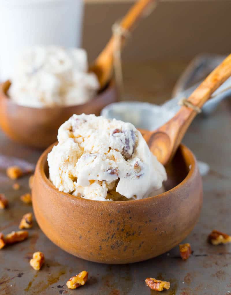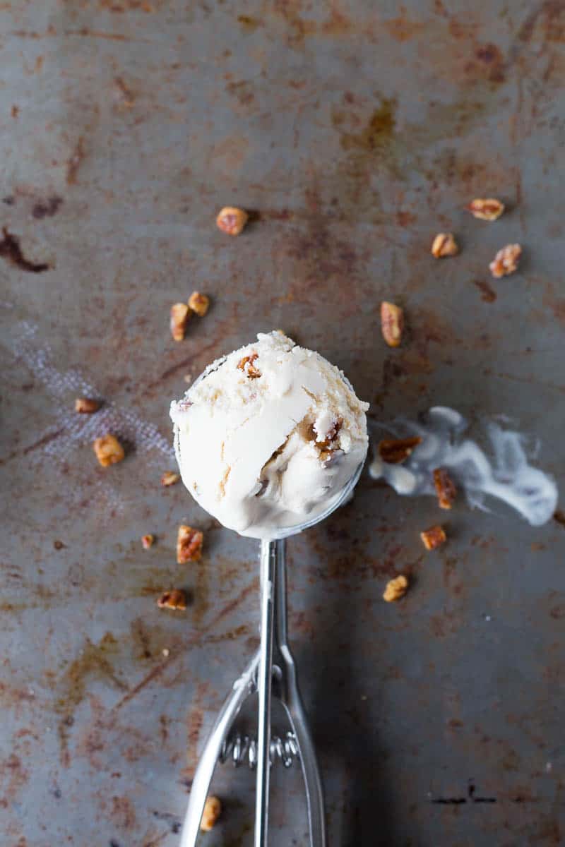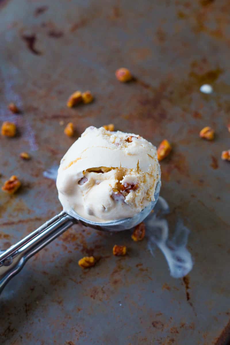 - Pour the mixture in the ice cream maker according to manufacturer instructions and allow to churn for 15-20 minutes until thickened. Using a rubber spatula, fold in the candied pecan pieces and place in a container for 2 hours before serving.