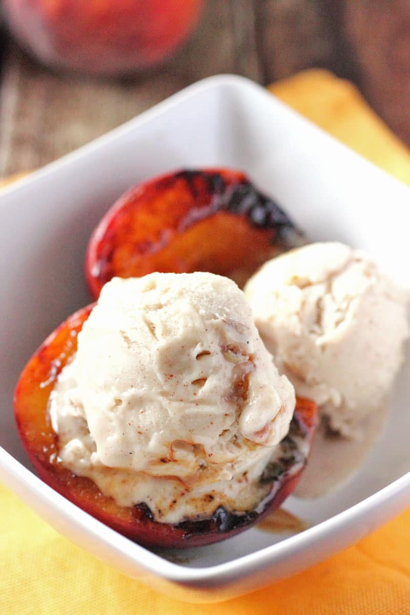 - Cut the peaches in half and remove the pit by using a spoon. Brush the halves of the peaches (inner half) with butter and sprinkle with cinnamon. Heat a grill pan on medium heat and brush with more butter. Place the peach (fruit half down) on the grill and allow to grill for 3-5 minutes and remove.