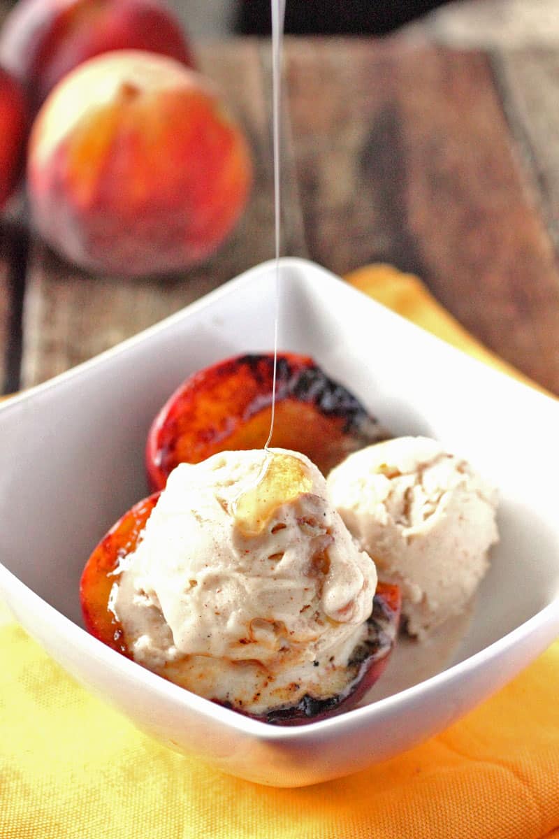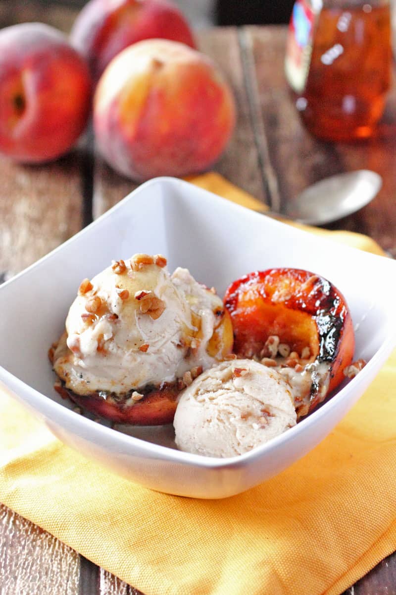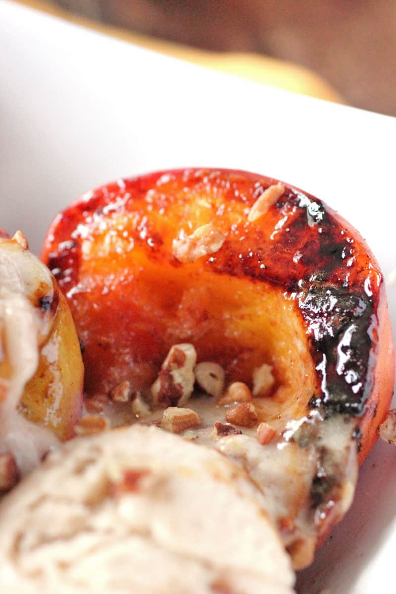This Honey Drizzled Grilled Peaches recipe can be enjoyed with ice cream and pecans!