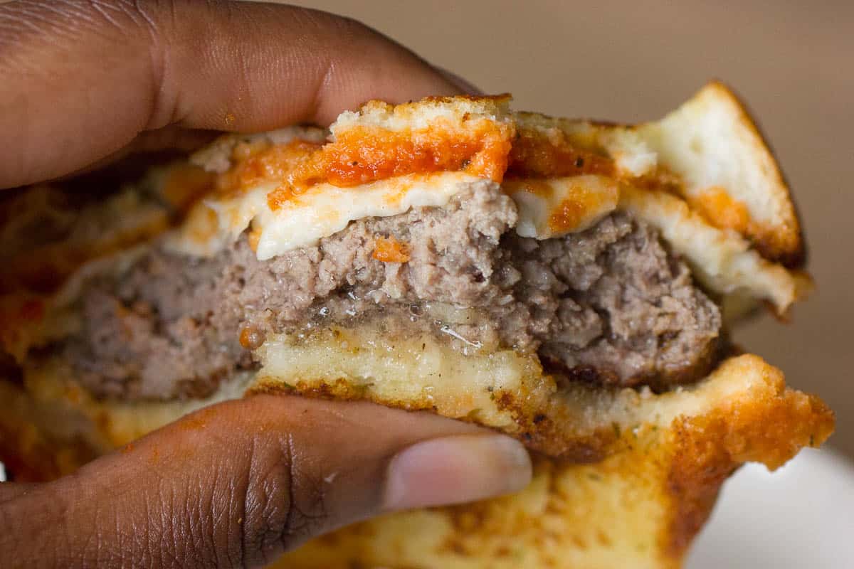 - Once the burgers are flipped on their last side and is just about done, place a single slice of fresh mozzarella cheese on top of the burgers and cover the skillet with a large plate or another skillet of the same size creating a dome. Keep covered for about 2-3 minutes until cheese has melted. Remove burgers from skillet and place on top of one piece of Texas Toast, pour some of the marinara sauce on top of the burgers, and finally place the other piece of Texas Toast on top and serve.
