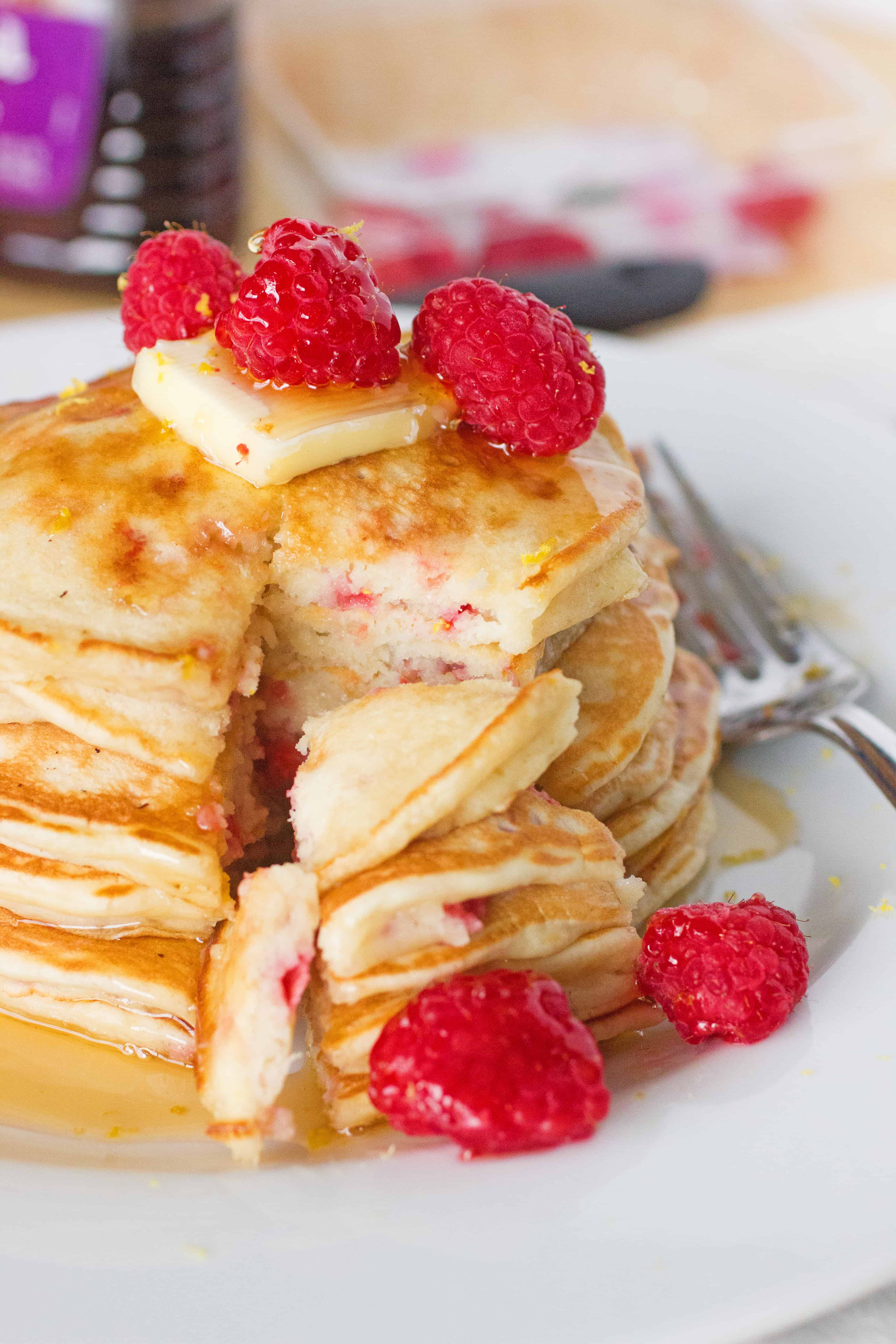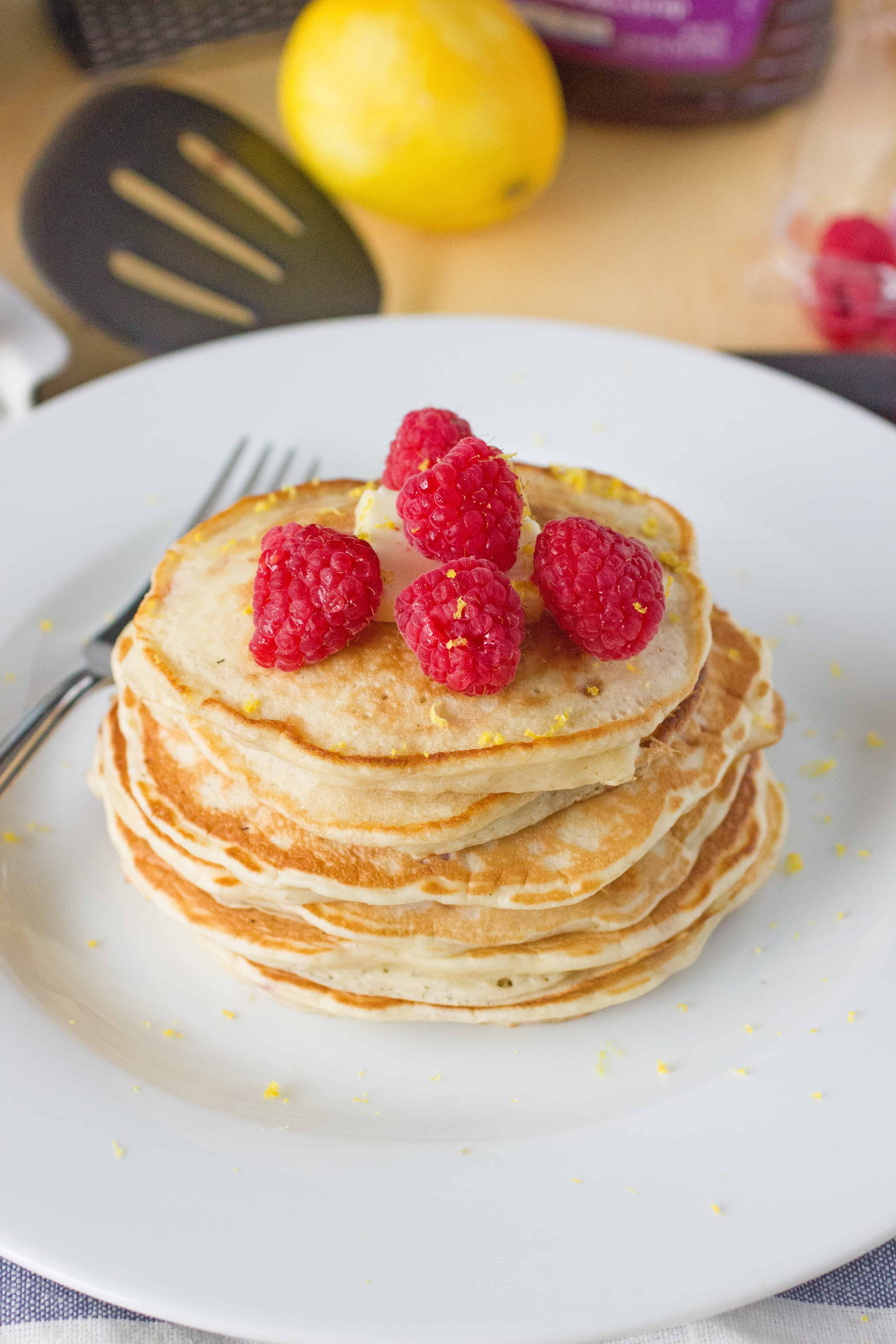 These are light and fluffy Lemon and Raspberry Yogurt Pancakes.