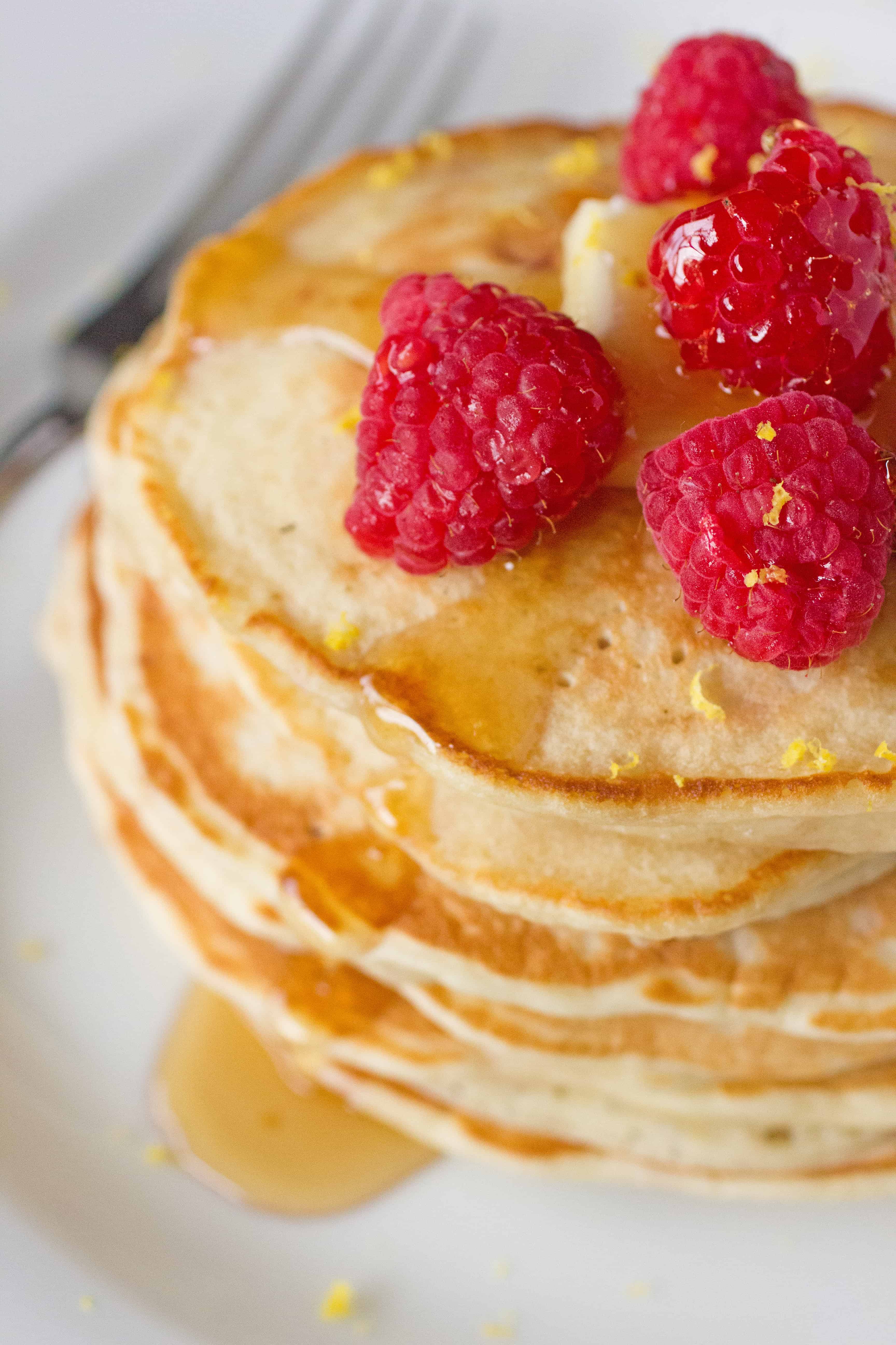- On a heated griddle or fry pan, melt the butter a tablespoon at a time and pour about 1/2 c. of pancake batter onto the the heated surface and allow to cook on each side for about 1-2 minutes. once the edges of the pancakes are set and you begin to see bubble in the middle flip onto other side and cook for another minute. Garnish with fresh raspberries and lemon zest. serve with warm syrup and enjoy!