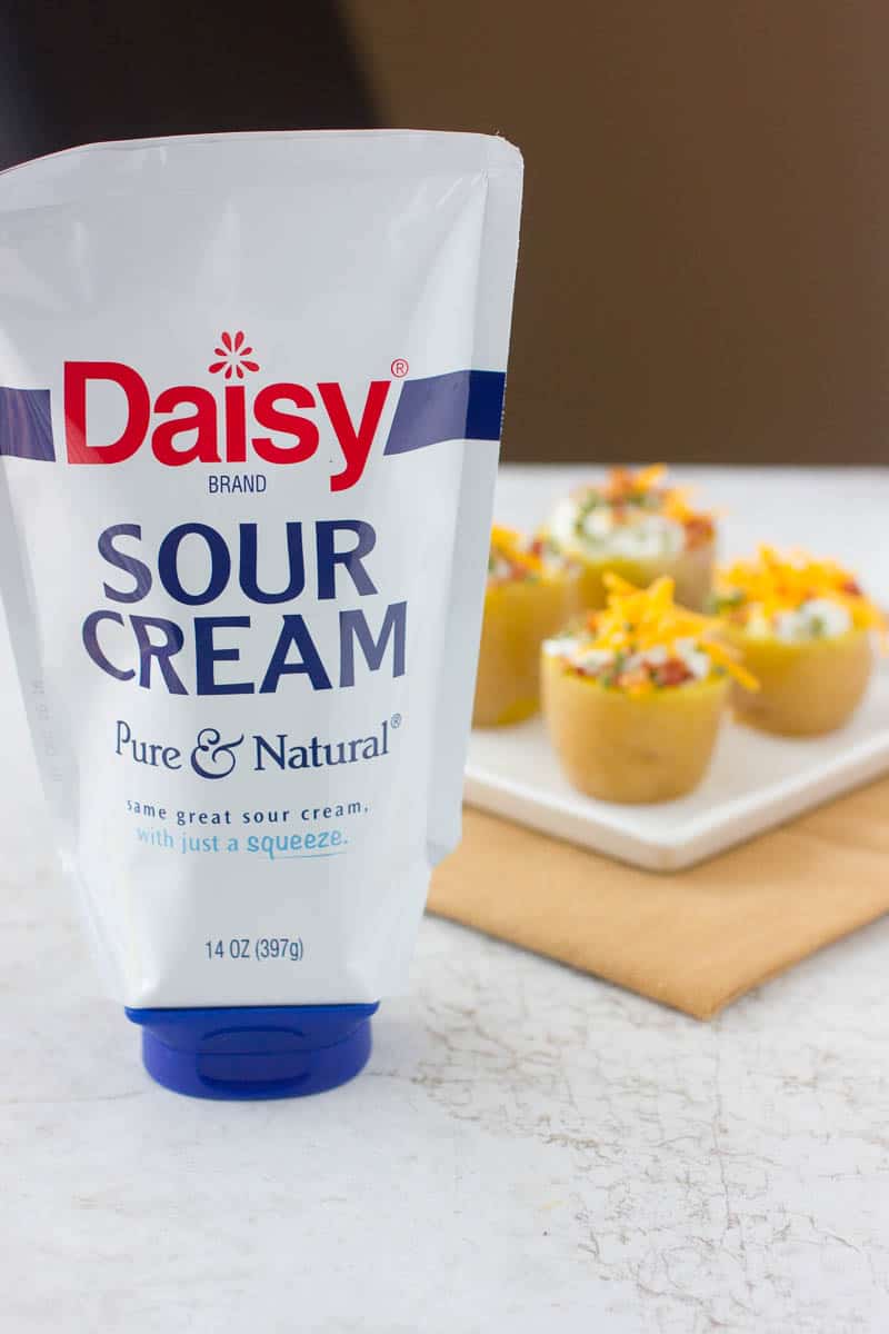 The one thing I love about this time of year are all the holiday parties! I feel that people get really creative when it comes to appetizers and holiday treats for holiday parties and I am always enthusiastic to try them! I am also enthusiastic to make them! I don’t know about you but when I throw a party of any kind, I prefer to make small appetizers. They are simple, quick, and requires little to no clean up. In addition, I like to make mini versions of big food options like Mini Chicken and Waffle Sandwiches, Mini Sliders, or these Loaded Baked Potato Bites. In my mind, I enjoy eating mini foods better because I feel that I am eating more for less calories and I am eating a lot of different meals but smaller. Does that make sense? Well, it makes a ton of sense to me. So you can imagine how many Loaded Baked Potato Bites I ate when I finished making them. They are so addicting and delicious but I have to thank Daisy’s Sour Cream for making these bites as delicious as they are.