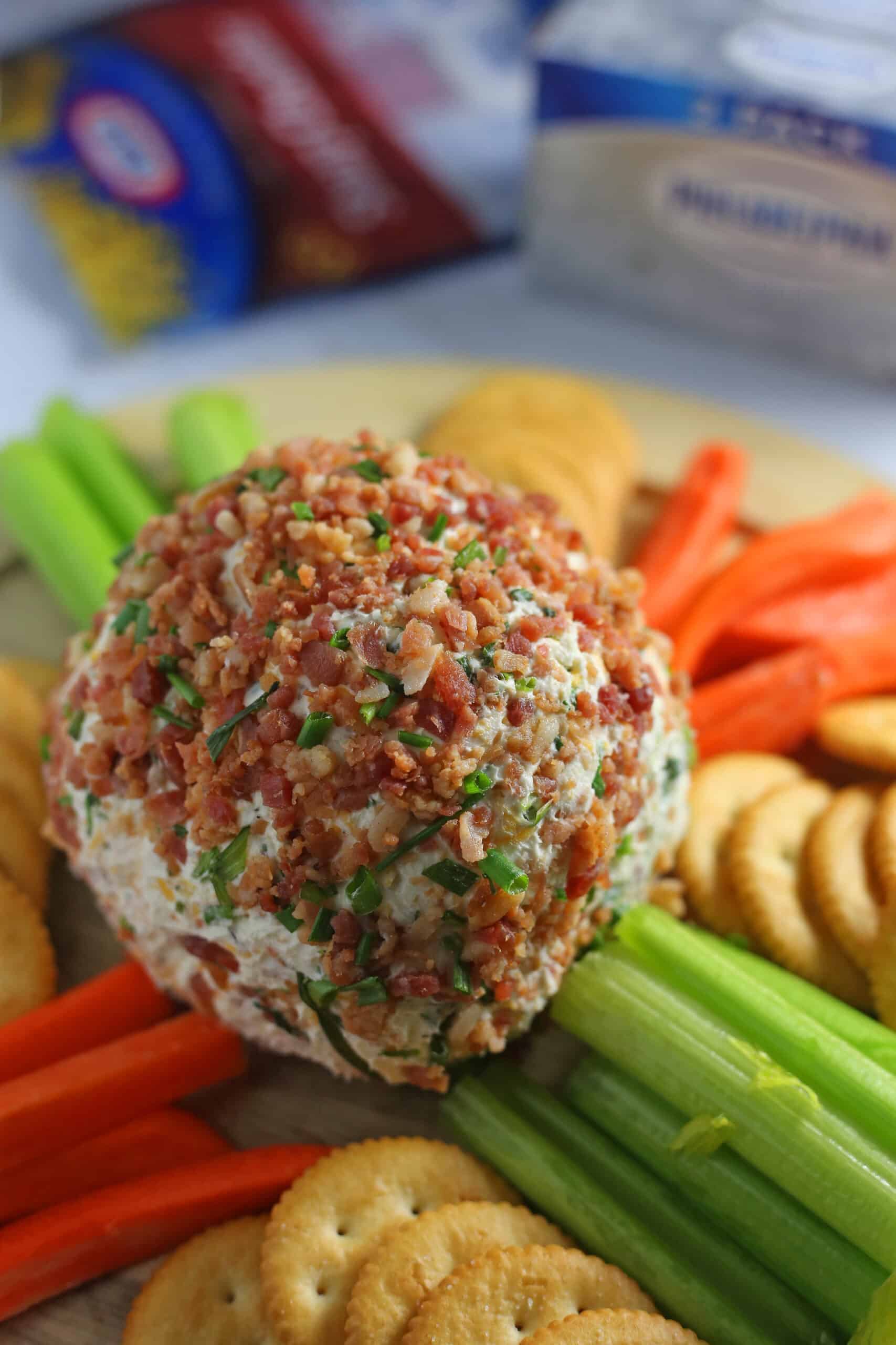 - Mix the remaining chives and bacon pieces on a plate and roll the cream cheese ball in them to coat. Place on a serving tray and serve immediately or chill in the fridge until ready to serve, up to 2 hours.