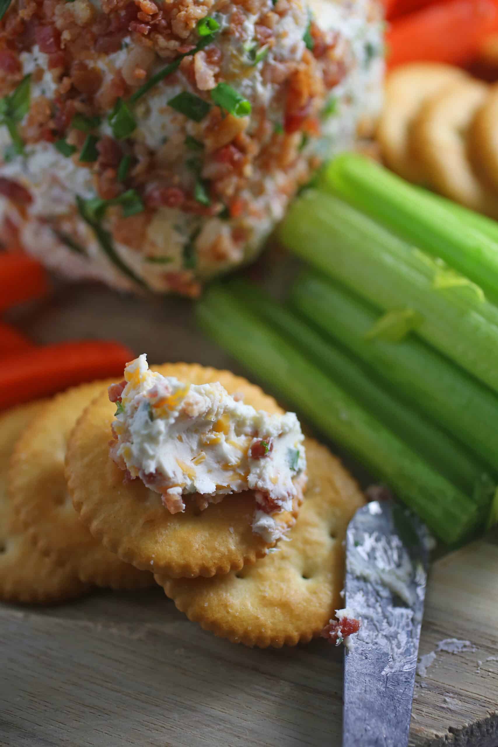 You can even turn this cheeseball into mini cheese ball bites. That is where you can take a heaping tablespoon of the cheeseball roll them into small balls and coat in the chopped bacon. That way your guest can grab a ball, put it on their plate, and go!