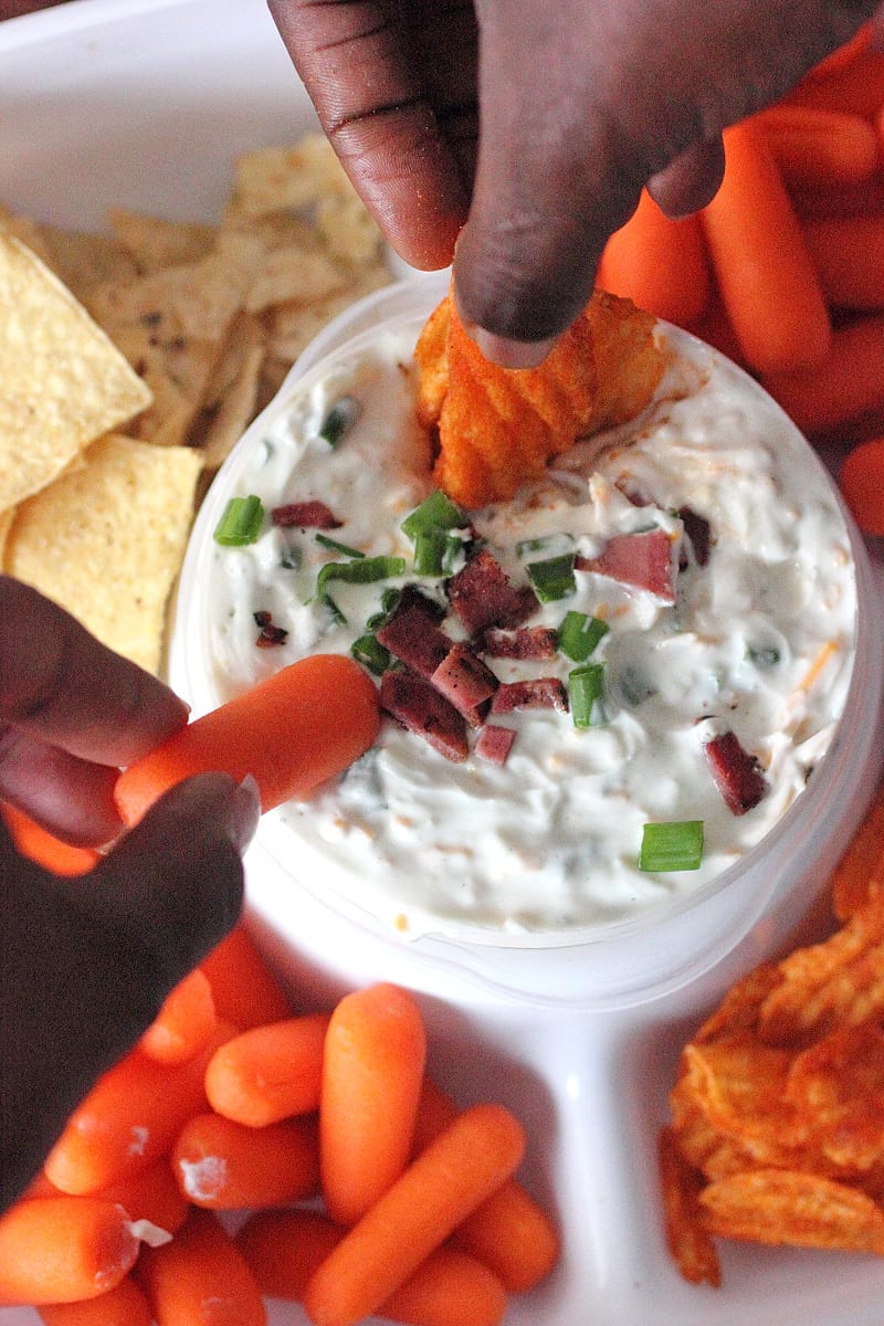 So I am trying to be a little healthier, right? I want to surround myself with healthier food options so I don’t get easily tempted to eat unhealthy food options. I must explain this because I know some of you are wondering why in the heck do I have almonds and carrots going to a tailgate party?! I know, but this is what I am becoming and I have lost 15 pounds this year so far to show for it. The delicious dip that you see in the awesome Rubber Maid © Party Platter is Loaded Baked Potato Dip. Now, I don’t know if you’ve had this dip before but it is insanely good. It traditionally made with sour cream, cheese, bacon, and some other stuff. Again, because I am trying to be healthy, I changed the sour cream to Plain Greek Yogurt, turkey bacon bits, low-fat cheese, and a packet of ranch mix. I promise it tastes the same! I kid you not! My family craves for “The Dip” every football gathering we have. Thanks to Rubber Maid, transporting all of my goodness from home to the game has never been easier!