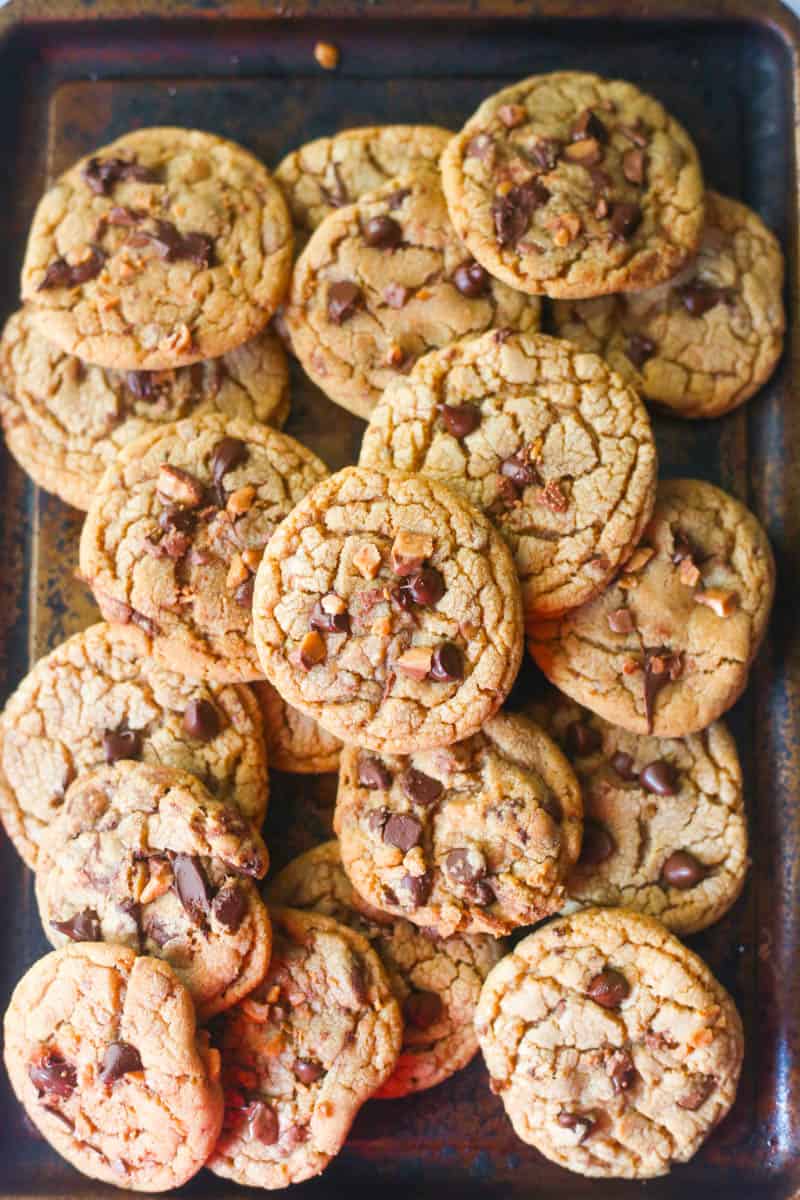 Loaded with chocolate chips, toffee pieces, and chopped pecans with cookie butter or Biscoff Spread, these Cookie Butter Cookies are soft and chewy and perfect for snacking.