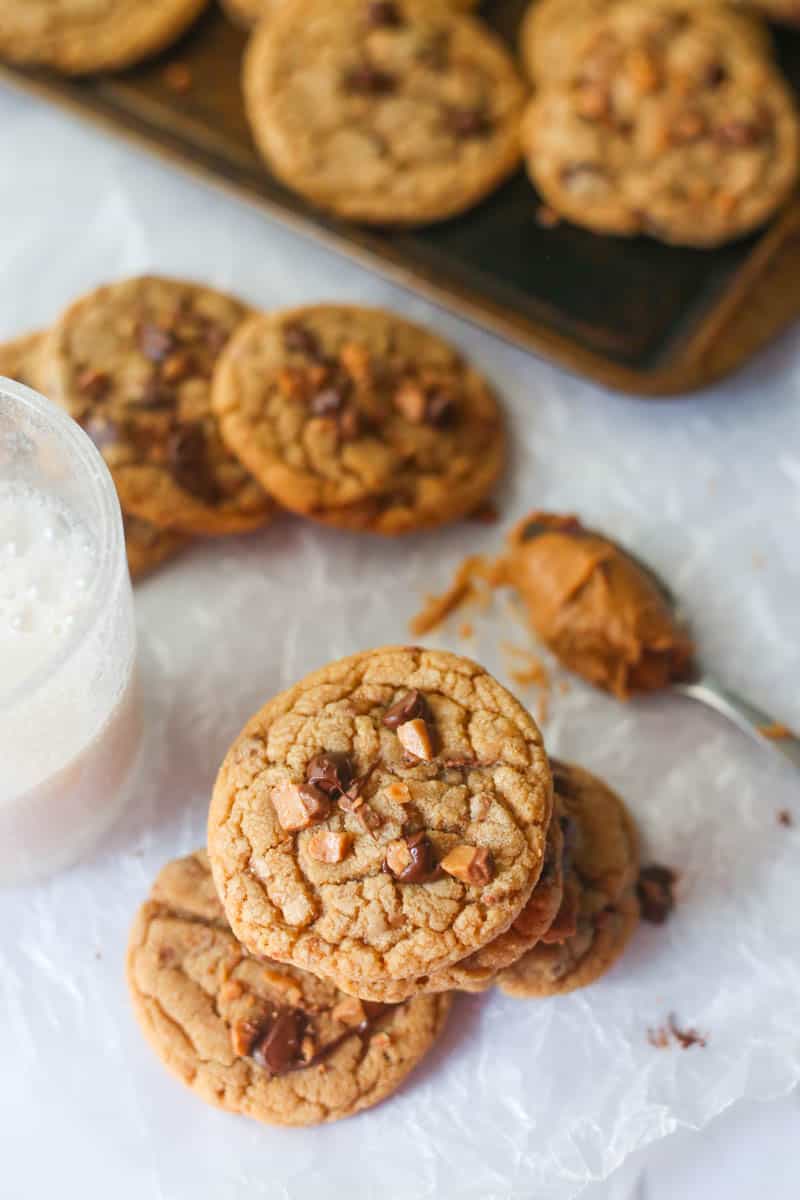 Loaded with chocolate chips, toffee pieces, chopped pecans, and cookie butter, or Biscoff Spread, these Loaded Cookie Butter Cookies will have you addicted at the first bite. They are soft and chewy and perfect for dipping in cold milk.