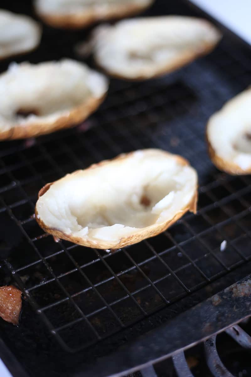 - Once you’ve baked your potatoes, allow them to cool. Slice them in half, lengthwise. Use a spoon to scoop out some of the potatoes on the inside. Not all of the potato, you don’t want just the skins. Sprinkle with salt and pepper to taste.