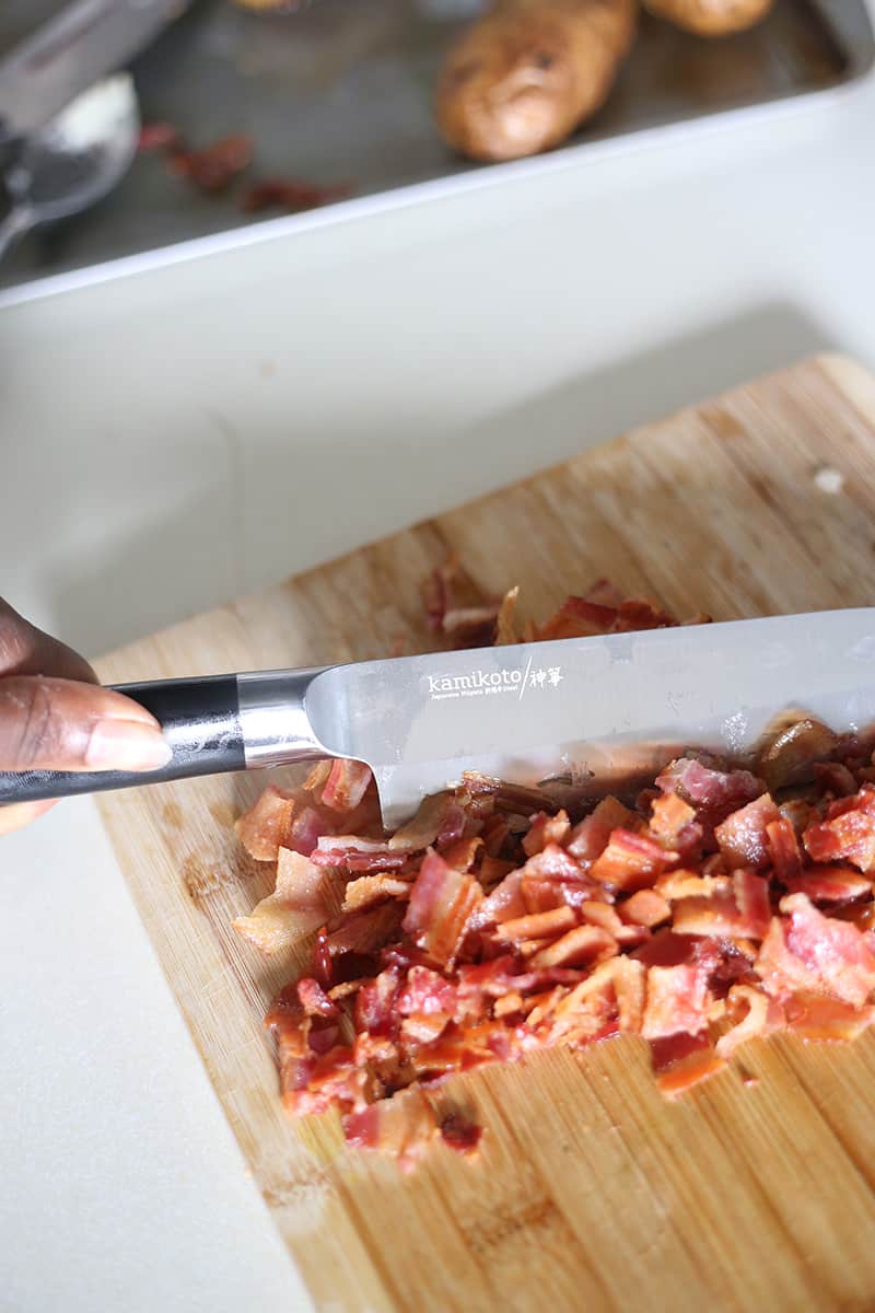 - Take half of the chopped bacon and fill the bottoms of the potato skins, sprinkle the cheese on top of the skins, and bake in the oven for 10 minutes, until the cheese has melted. Once the skins are done, take the other half of the bacon and sprinkle on top of the melted cheese, sprinkle with chives, a dollop of sour cream, and serve.