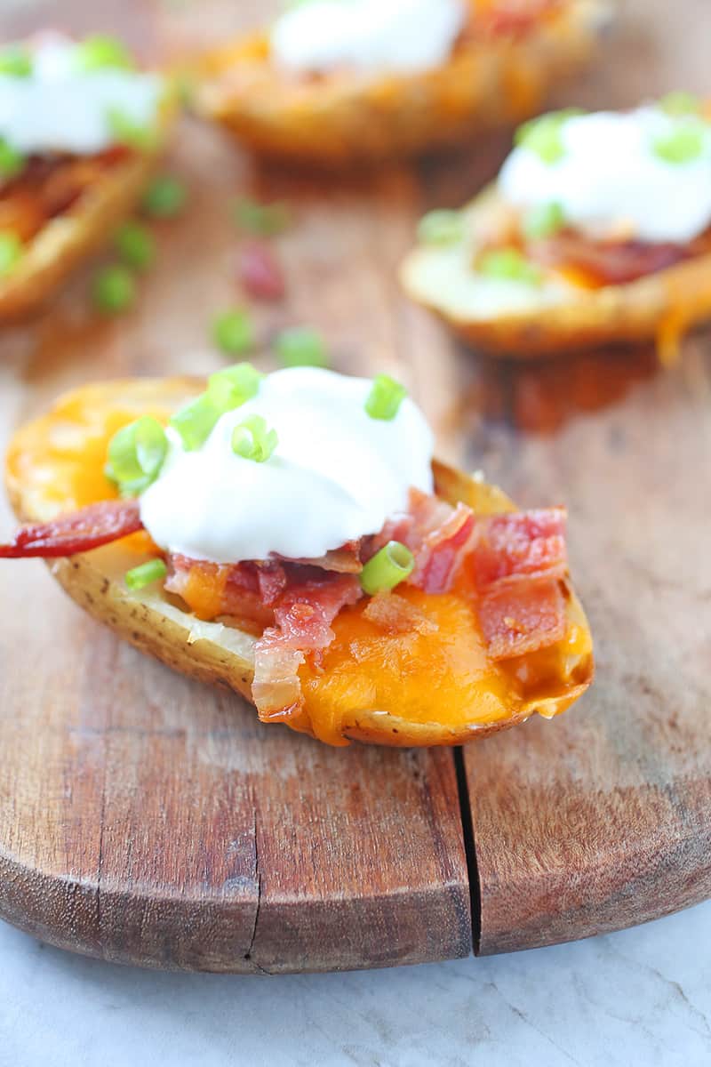 These loaded Potato Skins are double-loaded with bacon, filled with cheddar cheese, and topped off with sour cream!