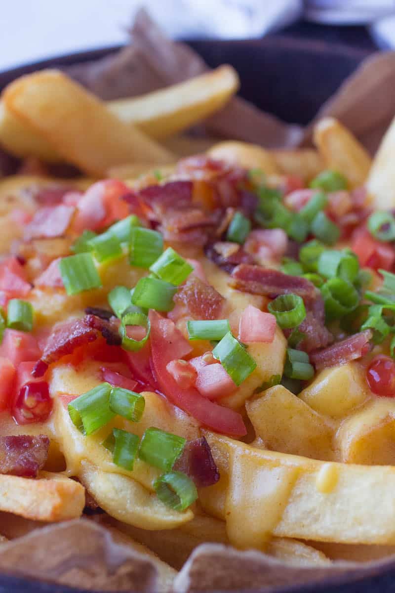 Now you know your girl had to try this at home. I didn’t want to make a poutine recipe as traditional as the one I just described as everyone may not have enough time to make the short ribs. So I fried my fries in regular peanut oil, made a delicious cheese gravy (cheese sauce) and topped the fries off with bacon, tomatoes, chives, and added the cheese curds to that delicious cheese sauce. Let me just say, we loved it! It wasn’t like the one we are used to but it came very close. I was thinking with football season approaching; this Loaded Poutine Recipe is perfect. You can cook your fries, lay them out on a large serving platter, add the toppings on top and let people go at it! I love dishes like this that are easy and self-serving. This will surely kick off your football season!