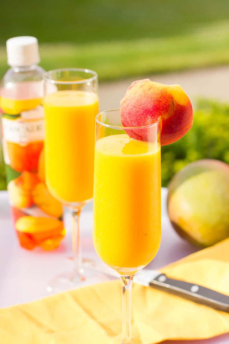 - Peel the peaches and the mangoes and cut the fruit into large chunks, utilizing as much of the fruit as possible. Pour the flavored sparkling water into a blender along with the fruit, and the ice cubes. Blend until smooth and pour into champagne flutes or desired drinking glass.