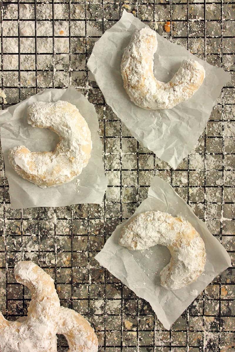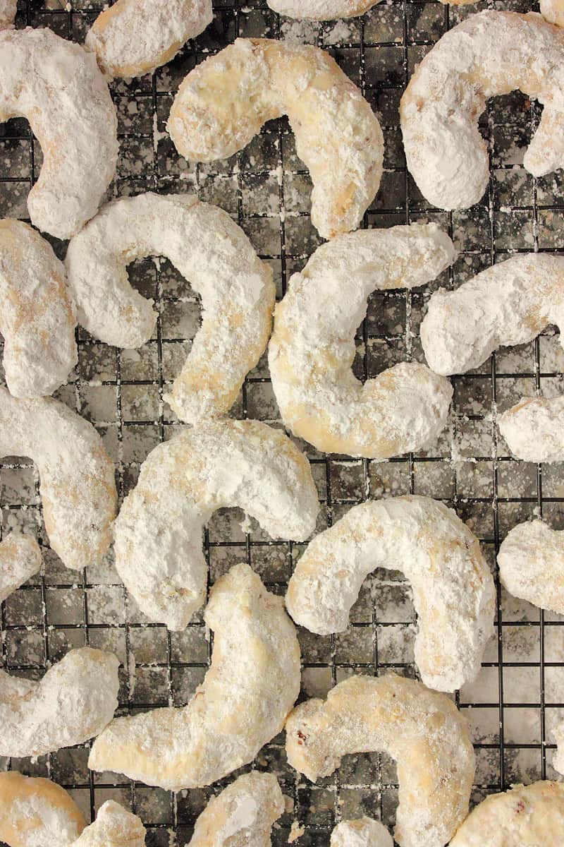 - In a large mixing bowl, cream the butter, vanilla extract, salt, and powdered sugar. Slowly add the flour and pecans. Flour your hands and take 1 tablespoon of cookie dough and shape into a half-moon and place on baking sheet. Repeat until baking sheet is full and bake for 35 minutes. Allow to cool slightly. Meanwhile, add about 1 cup of powdered sugar to a bowl and as soon as the cookies are cool enough to handle but still warm, coat with powdered sugar and place on cooling rack. Add more powdered sugar if needed. Repeat until all cookies are coated.