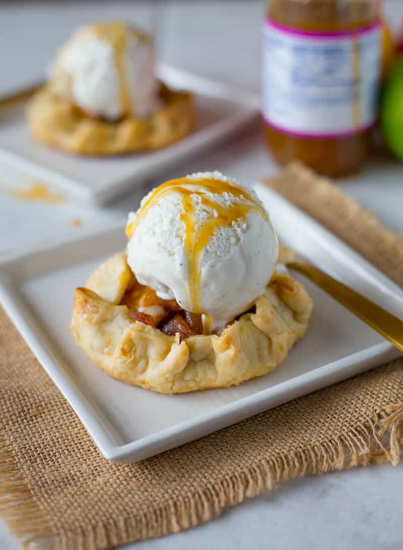 - Fold the exposed edges of the pie crust overlapping the crust making a pocket. Once the pies are assembled brush the edges of the crust with the tablespoon of butter and sprinkle with white coarse sugar and bake for 20-25 minutes in a preheated oven of 350 degrees. The crusts should be golden brown. Spoon a tablespoon of caramel sauce in the tarts and serve with ice cream.