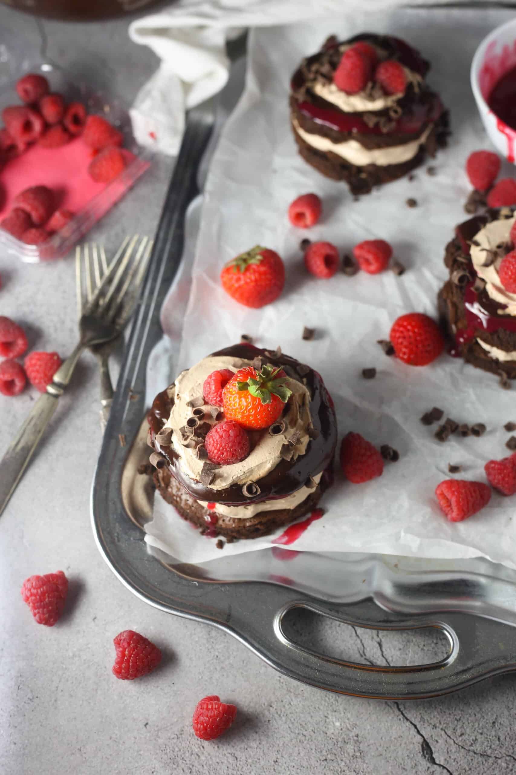 - Cut out your mini baby cakes, to create an even number (details for size and cutting are in the notes above). Take one cake, pipe chocolate mousse in the middle of the top, place another cake on top, pour some of the chocolate ganache on top of that. Then add a little of the raspberry sauce, and then more of the chocolate mousse. Now you have a baby cake! You can garnish with chocolate shards or chocolate curls and fresh raspberries. If you are making a bundt or layered cake, assemble similarly.