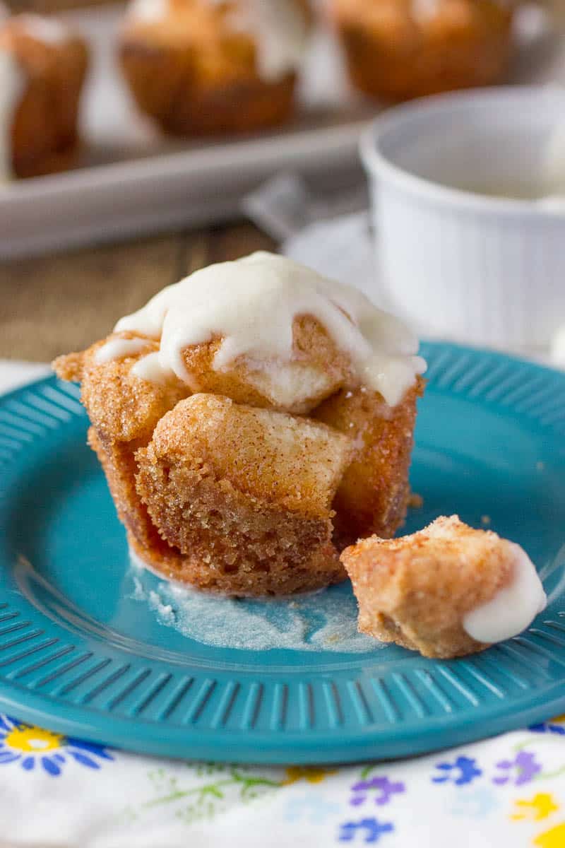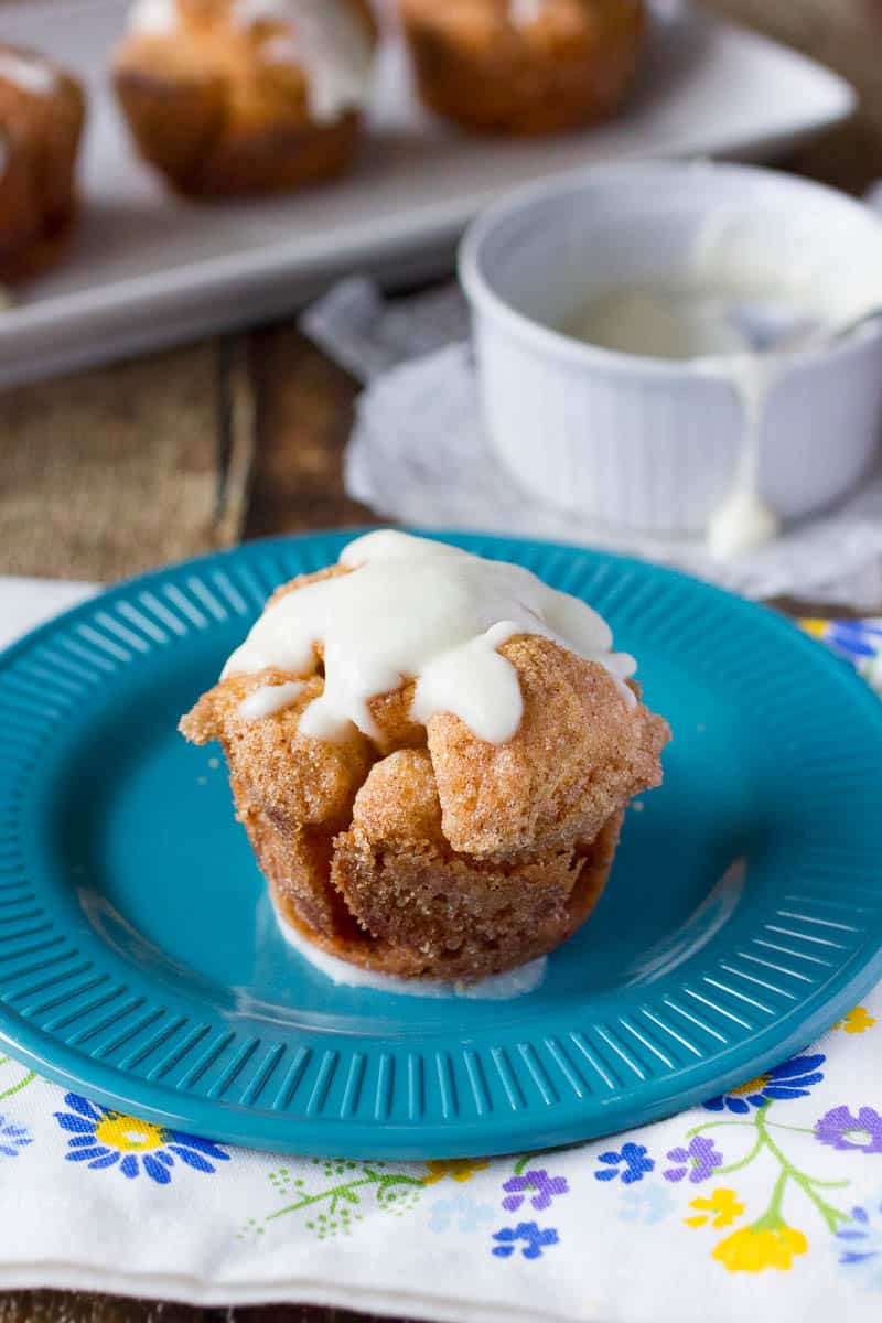 - In another small bowl, mix together the powdered sugar, melted butter, and milk until a thick glaze occurs. If the glaze is still thick add an extra tablespoon of milk at a time until desire consistency is reached. Spoon some of the glaze on top of each muffin and serve.