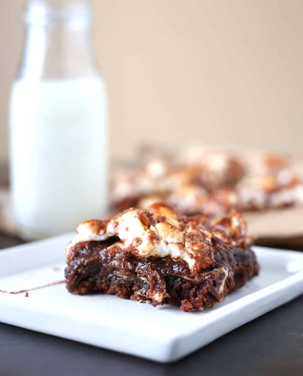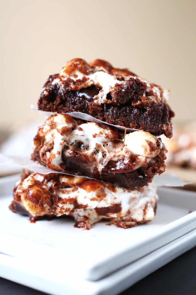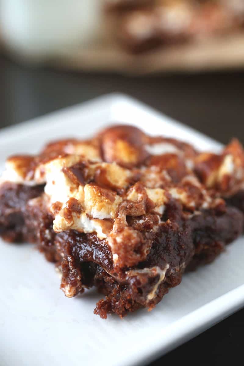 to come to a slight simmer. Remove from heat and whisk in the powdered sugar until smooth. Add the salt and vanilla extract. - Once the brownies are finished baking, add the marshmallows on top of the brownies while still warm, and pour on top of the marshmallows. Place back in the oven for 2-3 minutes until marshmallows are gooey and slightly puffed. Remove from oven and pour the frosting mixture on top of the marshmallows. NOTE: You may not need to use the entire frosting mixture as I did not. Place in the refrigerator for 30 minutes or longer to allow the frosting to set. Cut into squares and serve.