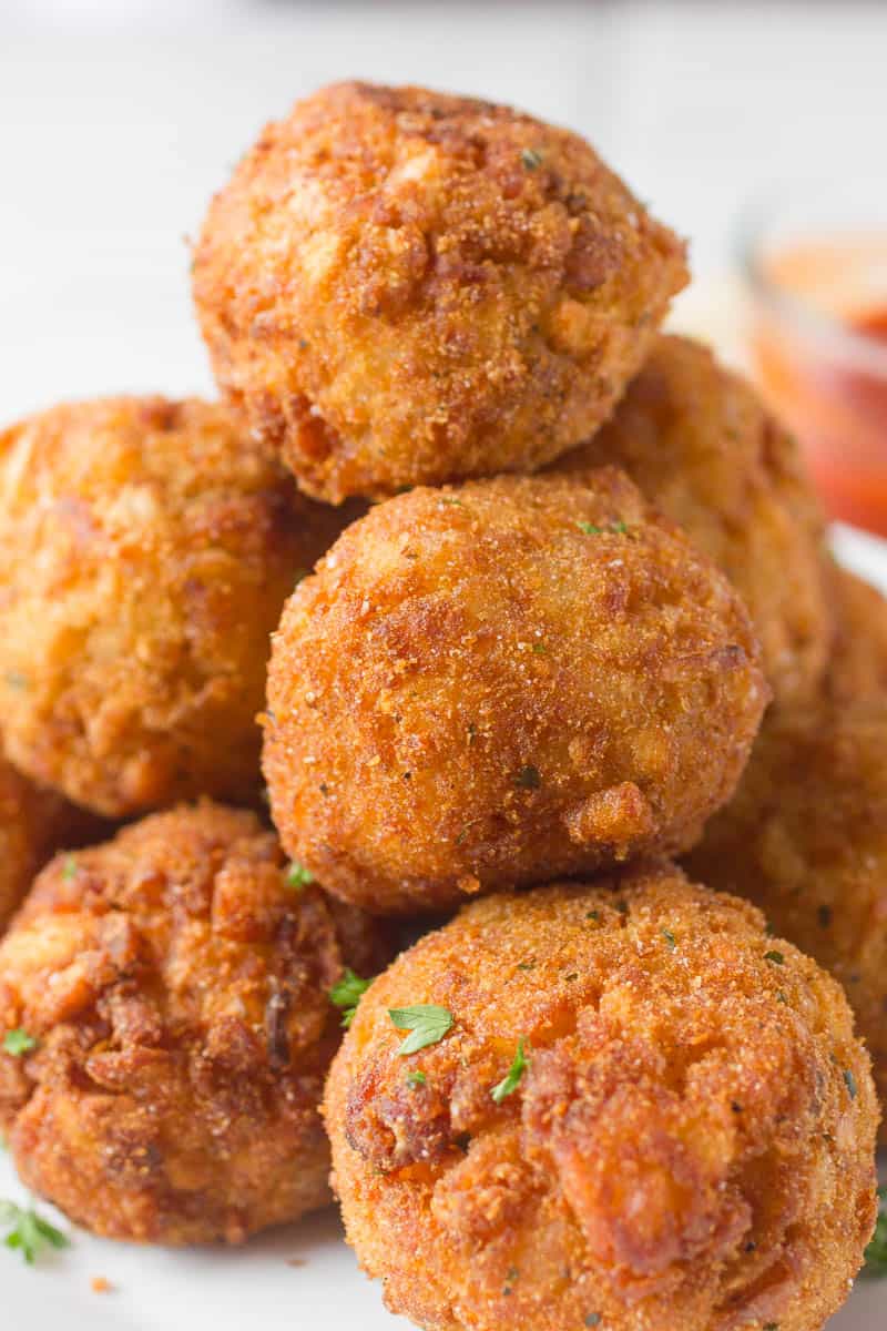 - Pour the veggie oil in a deep fryer on 350 Degrees. Place the breadcrumbs in a small bowl. Once the oil is ready, roll each ball in the breadcrumbs and carefully place in the oil and fry for about 6 minutes until golden brown. Turn to a plate lined with paper towel. Serve with warm marinara sauce or pizza sauce and serve!
