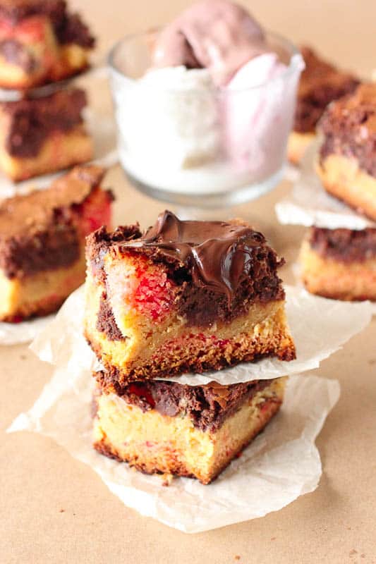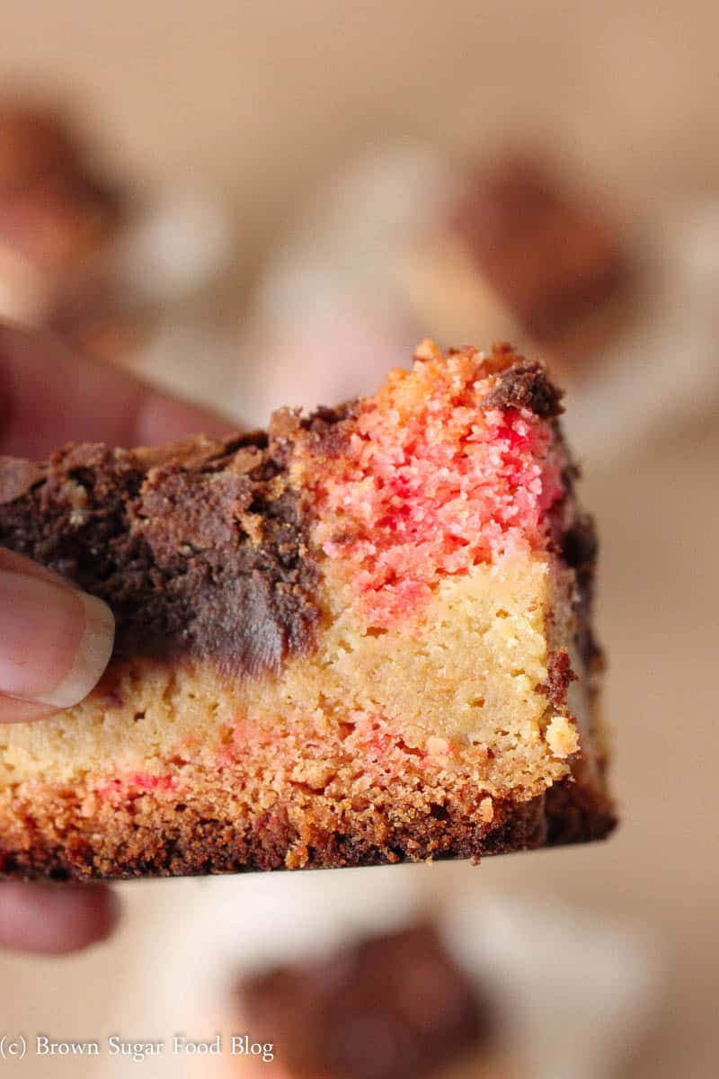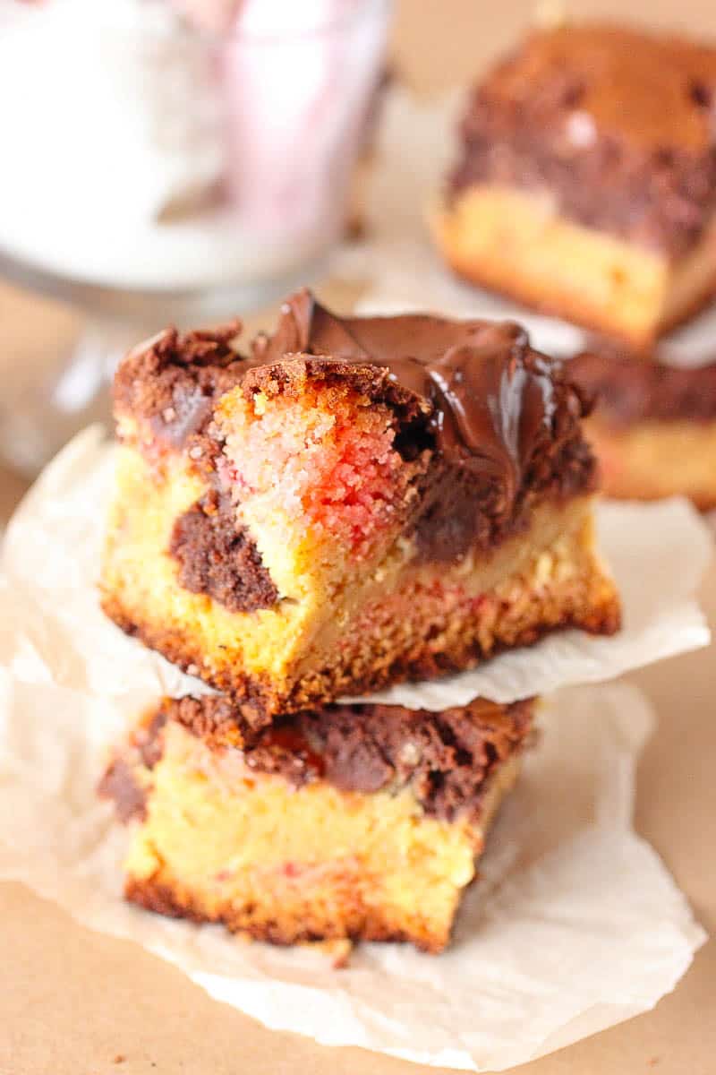 I can’t remember what I was doing, but I my boo was talking to me about something and I think I was talking to him about Neapolitan Cookies or ice cream and an idea slapped me in the face really hard to make Neapolitan Brownies! That day I started testing different recipes for strawberry and vanilla brownies to get an idea of how this awesome idea will come out. It came out, well, great! I was expecting for the layers to kind of back as it was layered but the brownies kind of marbleized on its own. I kind of liked it.