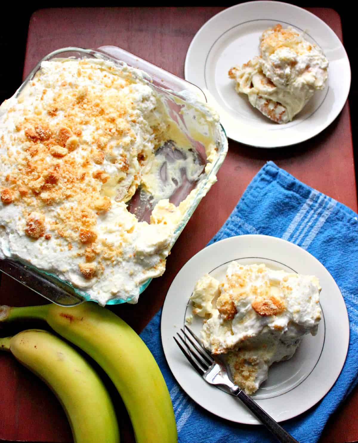 - Line the bottom of a 13x9x2 inch pan with 1 bag of cookies and layer bananas on top.