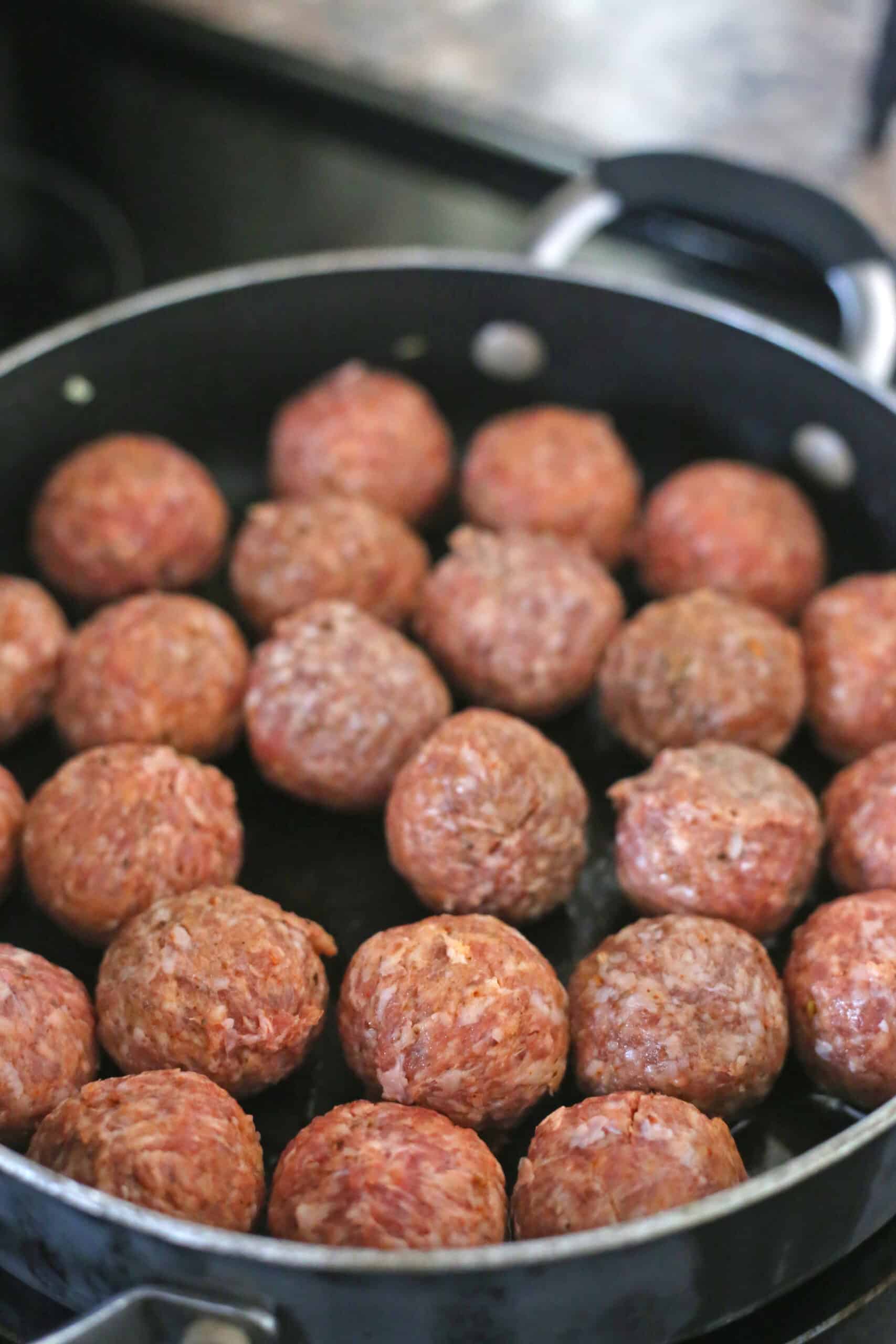 - In a large and shallow cooking pan, on medium-high heat, add the olive oil and when heated, add the meatballs to the pan and cook on both sides for 5-7 minutes. The meatballs will brown and appear golden brown on all sides.