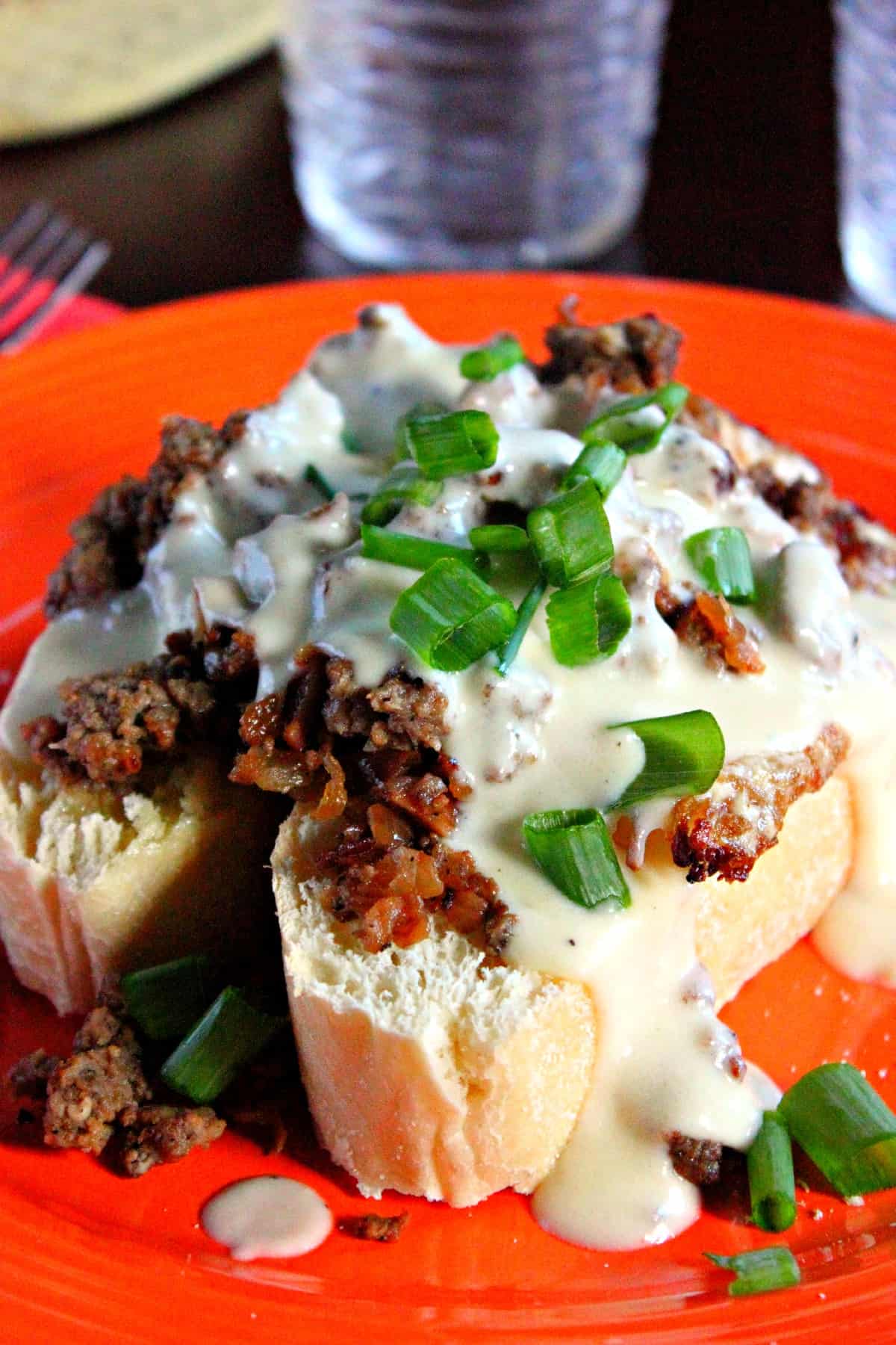 - Take the slices of ciabatta bread and brush each side with olive oil and turn to a preheated oven and allow to toast for about 5-7 minutes or to your liking. Remove from oven and place two pieces of the bread on a plate (or one if you prefer). Place the fried egg on top of the bread, pour some of the breakfast sausage on top of the fried egg, pour some of the cheese sauce on top and garnish with green chives.