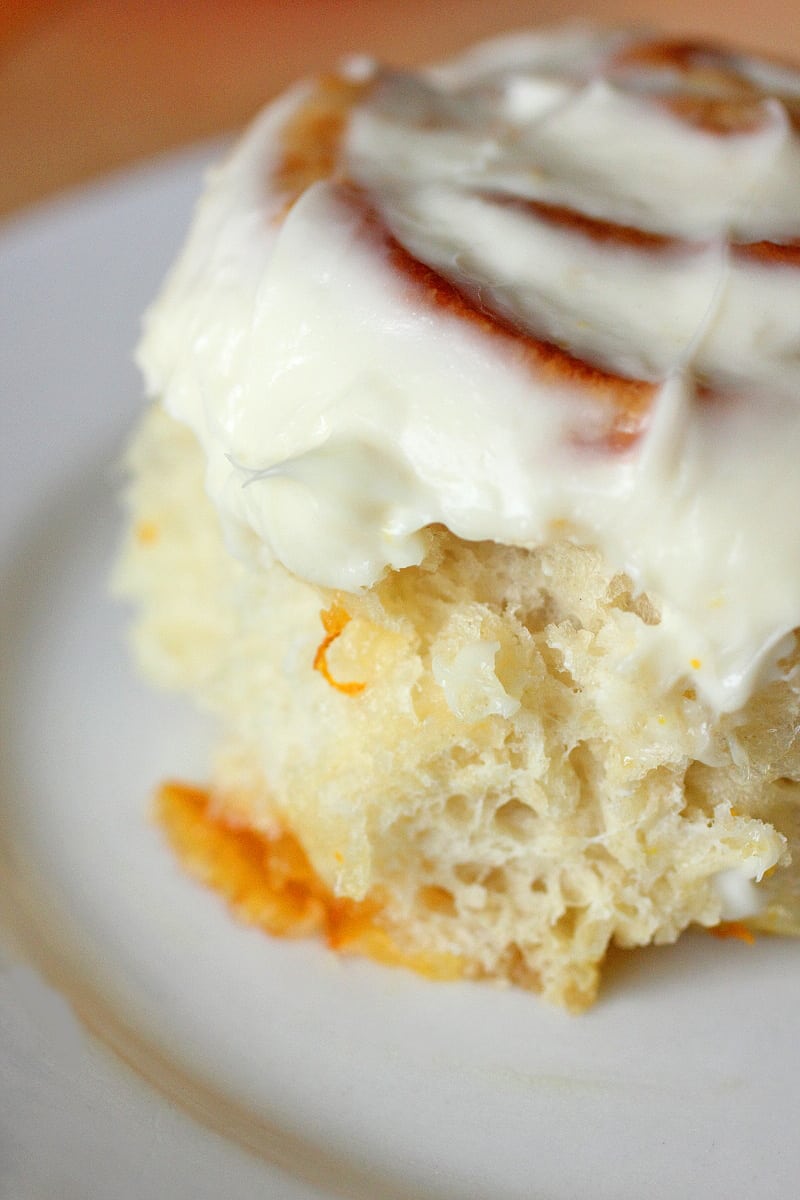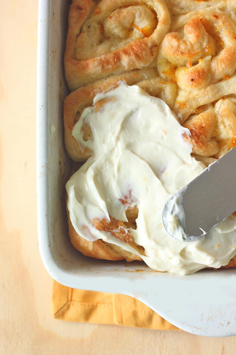 - Bake for 12-15 minutes until golden brown. Set aside and allow to cool. In a separate bowl, blend cream cheese until smooth, add powdered sugar, salt, and orange zest. Mix with hand held until smooth. Spread evenly on top of rolls and serve.