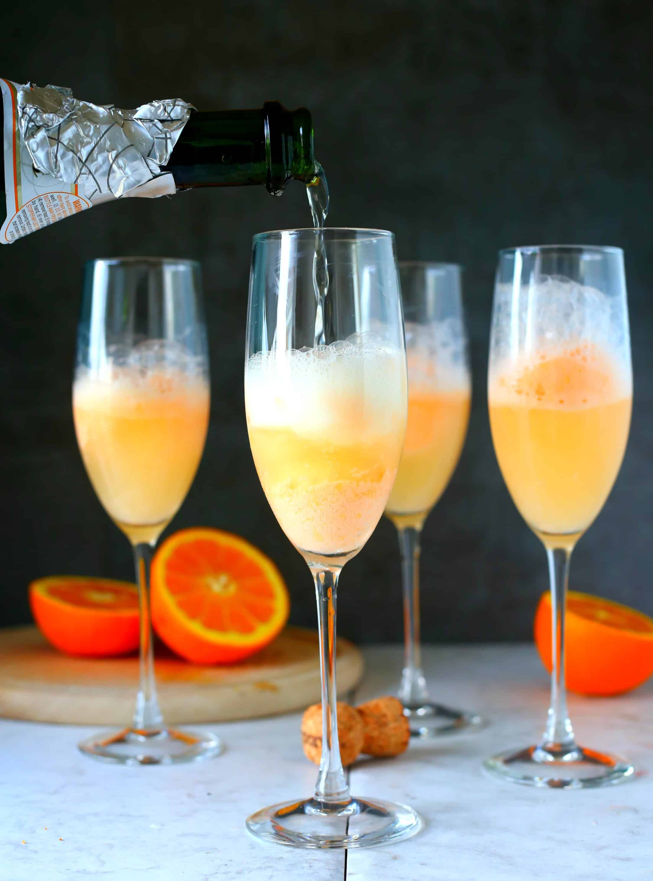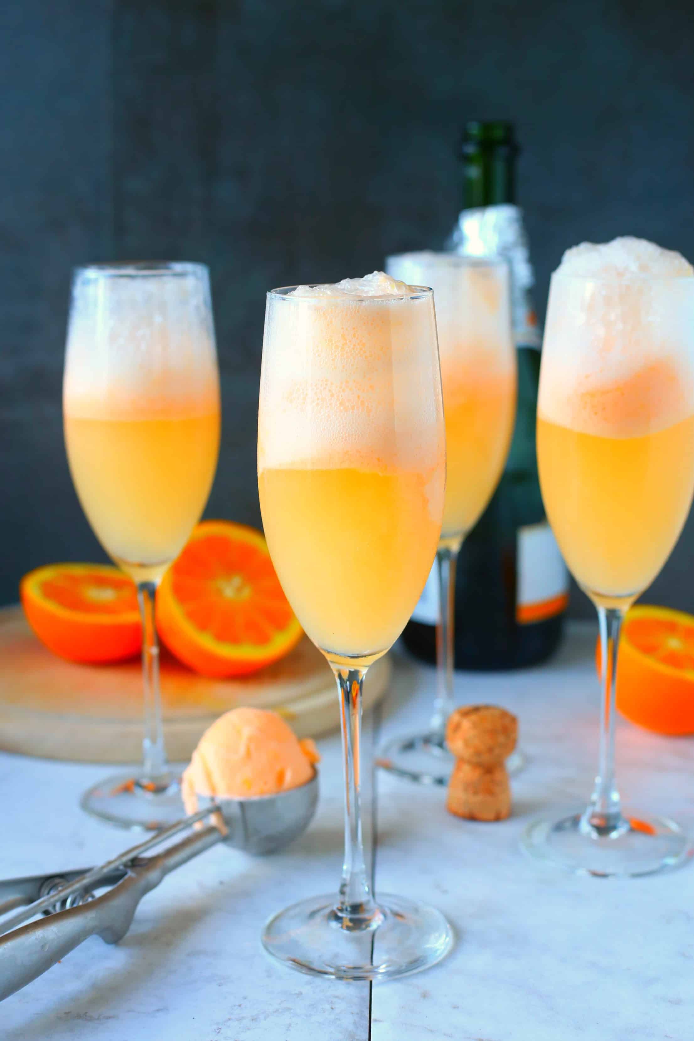 - In 4 champagne flutes, add two scoops of Orange Sherbert, about the size of a melon ball, using a small cookie scoop to the glasses. Pour sparkling wine into the glasses about ⅔ full and serve!