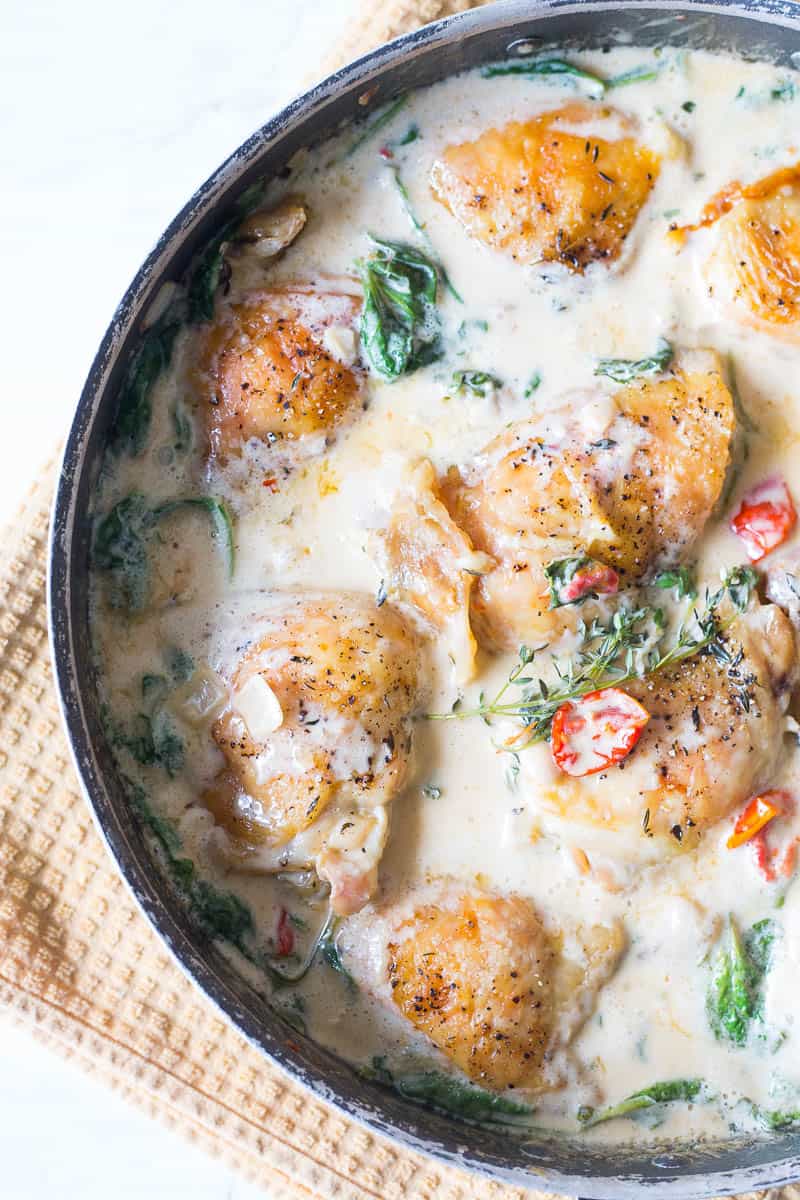 This Oven-Roasted Chicken Thighs Recipe is bathed in a delicious creamy sauce with sun-dried tomatoes and baby spinach!
